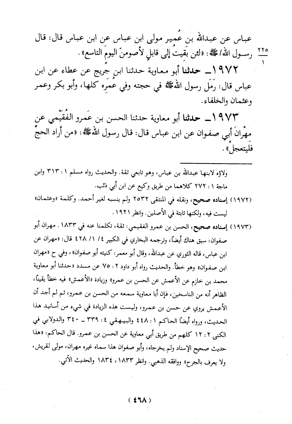 1973 - حدثنا أبو معاوية حدثنا الحسن بن عَمرو الفُقيَمي عن مِهْرانَ أبي صفوان عن ابن عباس قال: قال رسول الله - صلى الله عليه وسلم -: "من أراد الحجَّ فلَيتعجلْ".