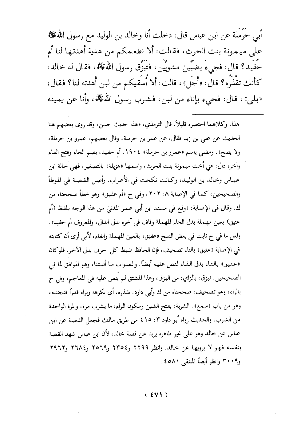 عباس عن خالد وهو على غيرظاهره يريد عن قصة خالد، لأن ابن عباس شهد القصة بنفسه فهو لا يرويها عن خالد. وانظر 2299 و 2354 و2569 و 2684 و 2962 و 3009 وانظر أيضاً المنتقى 4581.