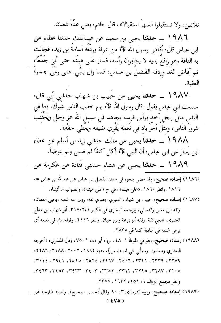 1986 - حدثنا يحيى بن سعيد عن عبد الملك حدثنا عطاء عن ابن عباس قال: أفاض رسول الله - صلى الله عليه وسلم - من عرفة ورِدْفُه أسامةُ بن زيد، فجالت به الناقة وهو رافعٌ يديه لا يجاوزان رأسه، فسار على هينَته حتى أتىِ جَمْعاً، ثم أفاض الغَدَ ورِدفه الفضلُ بن عباس، فما زال يلبَّي حتى رمى جمرةَ العقبة.