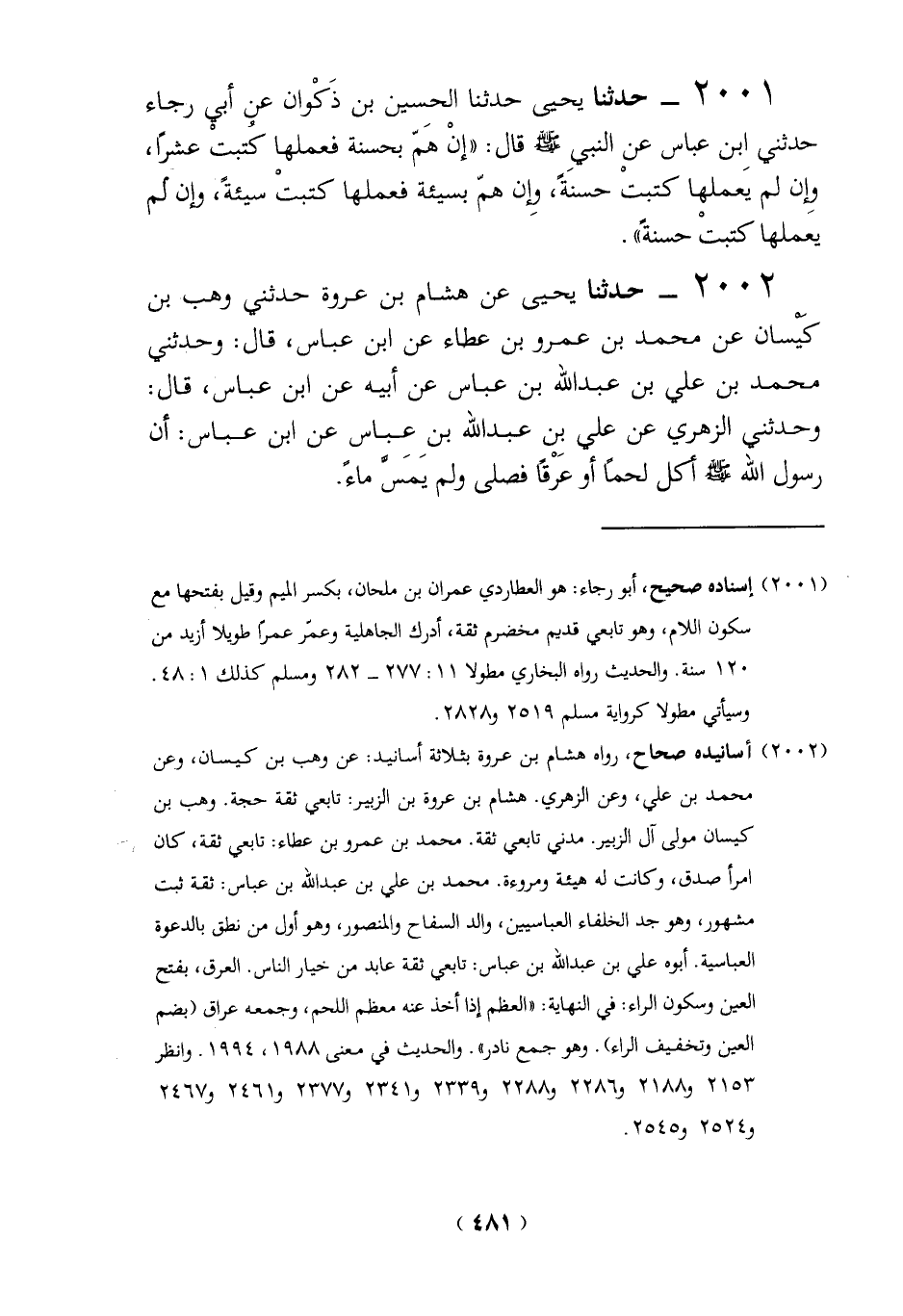 2001 - حدثنا يحيى حدثنا الحسين بن ذَكْوان عني أبي رجاء حدثني ابن عباس عن النبي - صلى الله عليه وسلم - قال: "إنْ هَمّ بحسنة فعملها كُتبت عشراً، وِإن لم يَعملها كتبتْ حسنةً، وِإن همّ بسيئة فعملها كتبتْ سيئةً، وإن لم يعملها كتبتْ حسنةً".