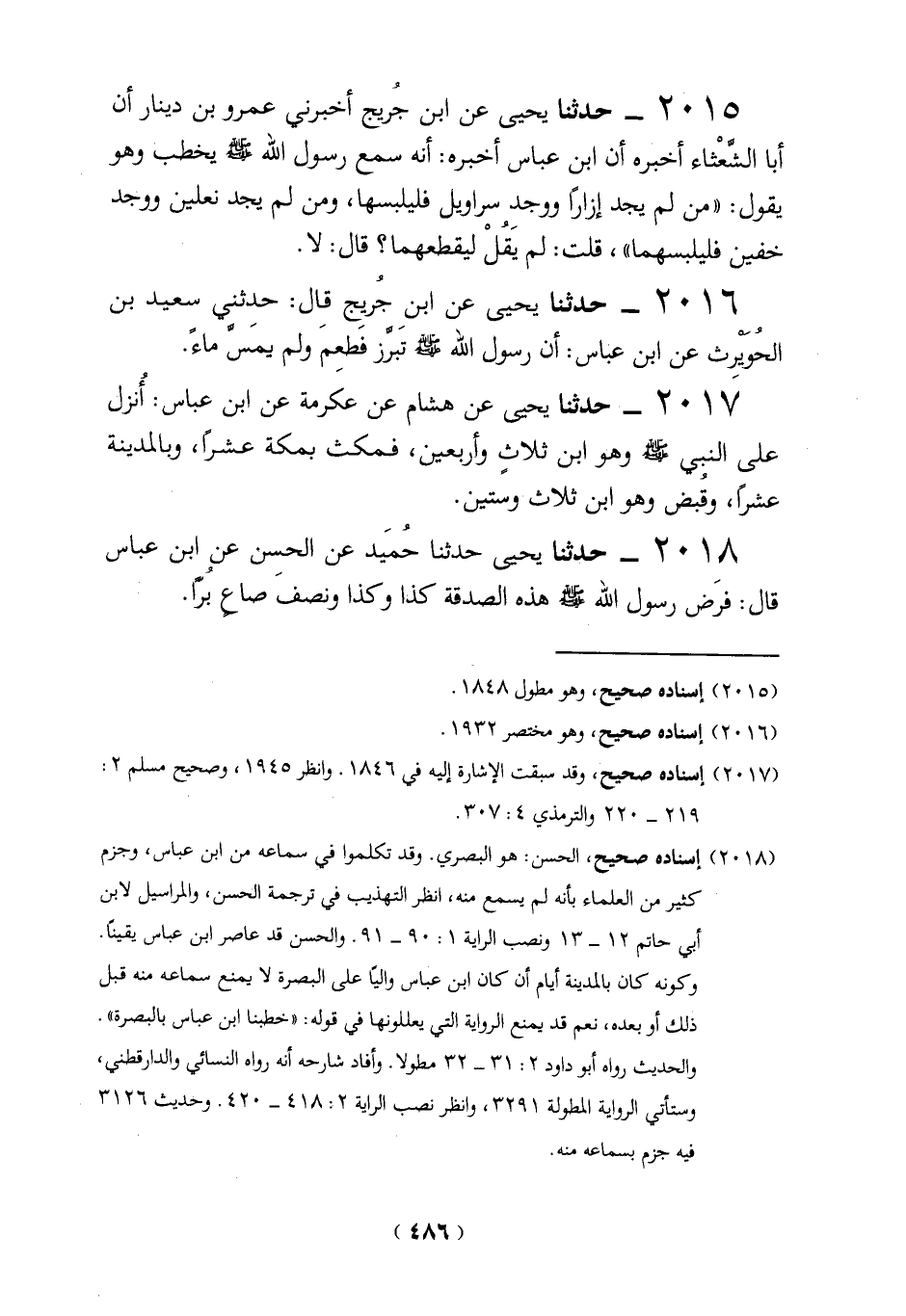 (2018) إسناده صحيح، الحسن: هو البصري. وقد تكلموا في سماعه من ابن عباس، وجزم كثير من العلماء بأنه لم يسمع منه، انظر التهذيب في ترجمة الحسن، والمراسيل لابن أبي حاتم 12 - 13 ونصب الراية 1: 90 - 91. والحسن قد عاصر ابن عباس يقيناً.