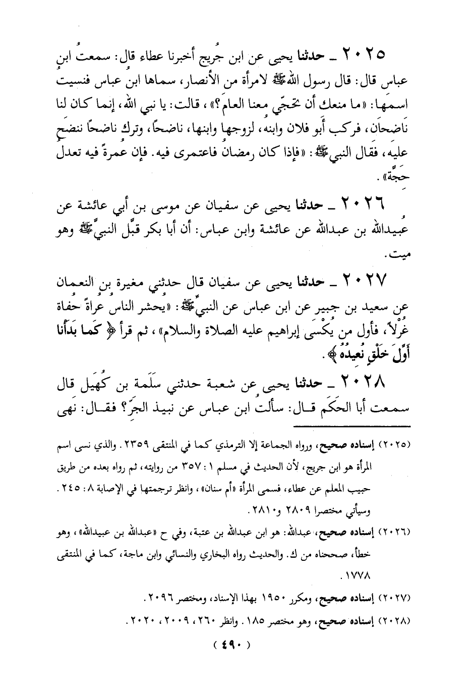 2027 - حدثنا يحيى عن سفيان قال حدثني مغيرة بن النعمان عن سعيد بن جبير عن ابن عباس عن النبيَّ - صلى الله عليه وسلم -: "يحشر الناس عُراةً خُفاة غرْلاً، فأول من يُكْسَي إبراهيم عليه الصلاة والسلام"، ثم قرأ {كَمَا بَدَأْنَا أَوَّلَ خَلْقٍ نُعِيدُهُ}.