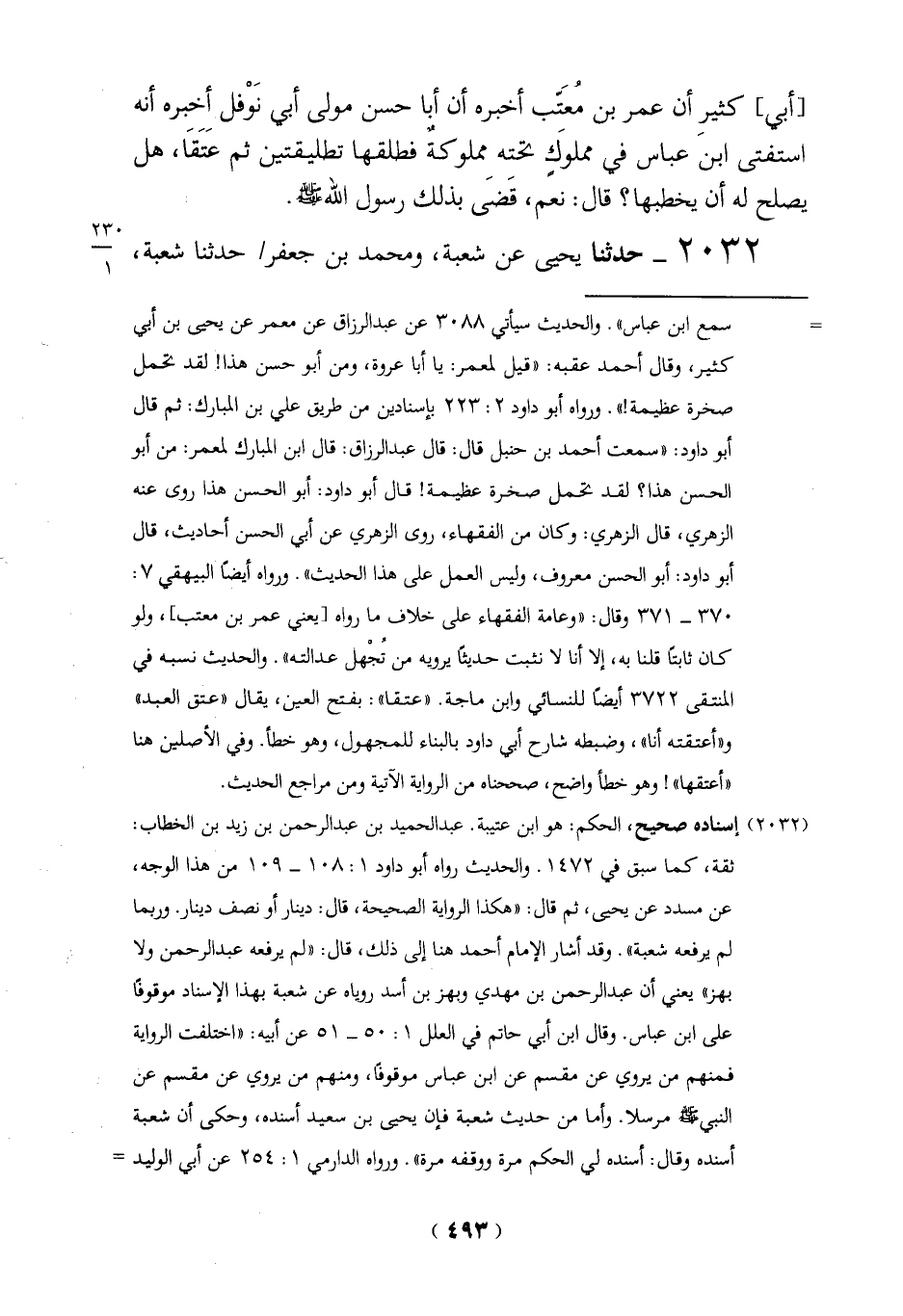 = سمع ابن عباس". والحديث سيأتي 3088 عن عبد الرزاق عن معمر عن يحيى بن أبي كثير، وقال أحمد عقبه: "قيل لعمر: يا أبا عروة، ومن أبو حسن هذا! لقد تحمل صخرة عظيمة! ". ورواه أبو داود 2: 223 بإسنادين من طريق على بن المبارك: ثم قال أبو داود: "سمعت أحمد بن حنبل قال: قال عبد الرزاق: قال ابن المبارك لمعمر: من أبو الحسن هذا؟ لقد تحمل صخرة عظيمة! قال أبو داود: أبو الحسن هذا روى عنه الزهري، قال الزهري: وكان من الفقهاء، روى الزهري عن أبي الحسن أحاديث، قال أبو داود: أبو الحسن معروف، وليس العمل على هذا الحديث!. ورواه أيضاً البيهقي 7: 370 - 371 وقال: "وعامة الفقهاء على خلاف ما رواه [يعني عمر بن معتب]، ولو كان ثابتاً قلنا به، إلا أنا لا نثبت حديثاً يرويه من تُجْهل عدالته". والحديث نسبه في المنتقى 3722 أيضاً للنسائي وابن ماجة. "عتقا": بفتح العين، يقال "عتق العبد" و"أعتقته أنا"، وضبطه شارح أبي داود بالبناء للمجهول، وهو خطأ. وفى الأصلين هنا "أعتقها"! وهو خطأ واضح، صححناه من الرواية الآتية ومن مراجع الحديث.