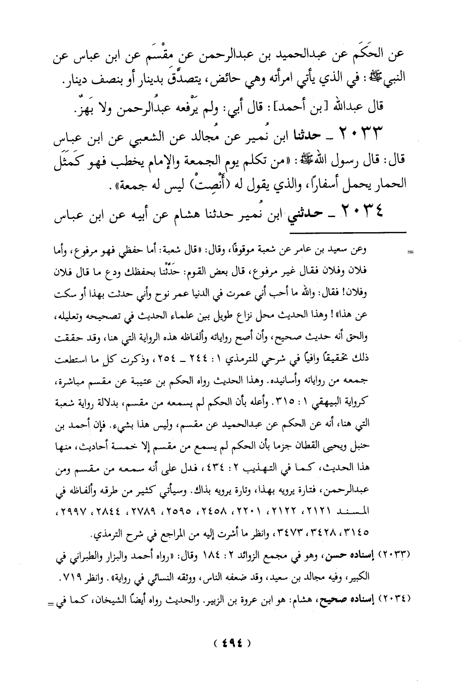 2033 - حدثنا ابن نُمير عن مُجالد عن الشعبي عن ابن عباس قال: قال رسول الله - صلى الله عليه وسلم -: "من تكلم يوم الجمعة والإمام يخطب فهو كَمَثَل الحمار يحمل أسفاراً، والذي يقول له (أنصِتْ) ليس له جمعة".