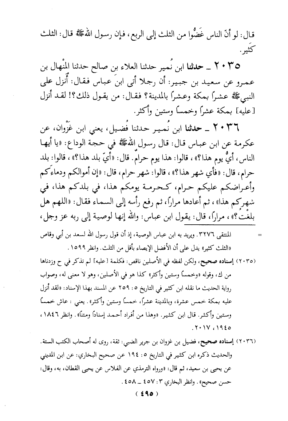 = المنتقى 3276. ويريد به ابن عباس الوصية، إذ أن قول رسول الله لسعد بن أبي وقاص "الثلث كثير" يدل على أن الأفضل الإيصاء بأقل من الثلث. وانظر 1599.