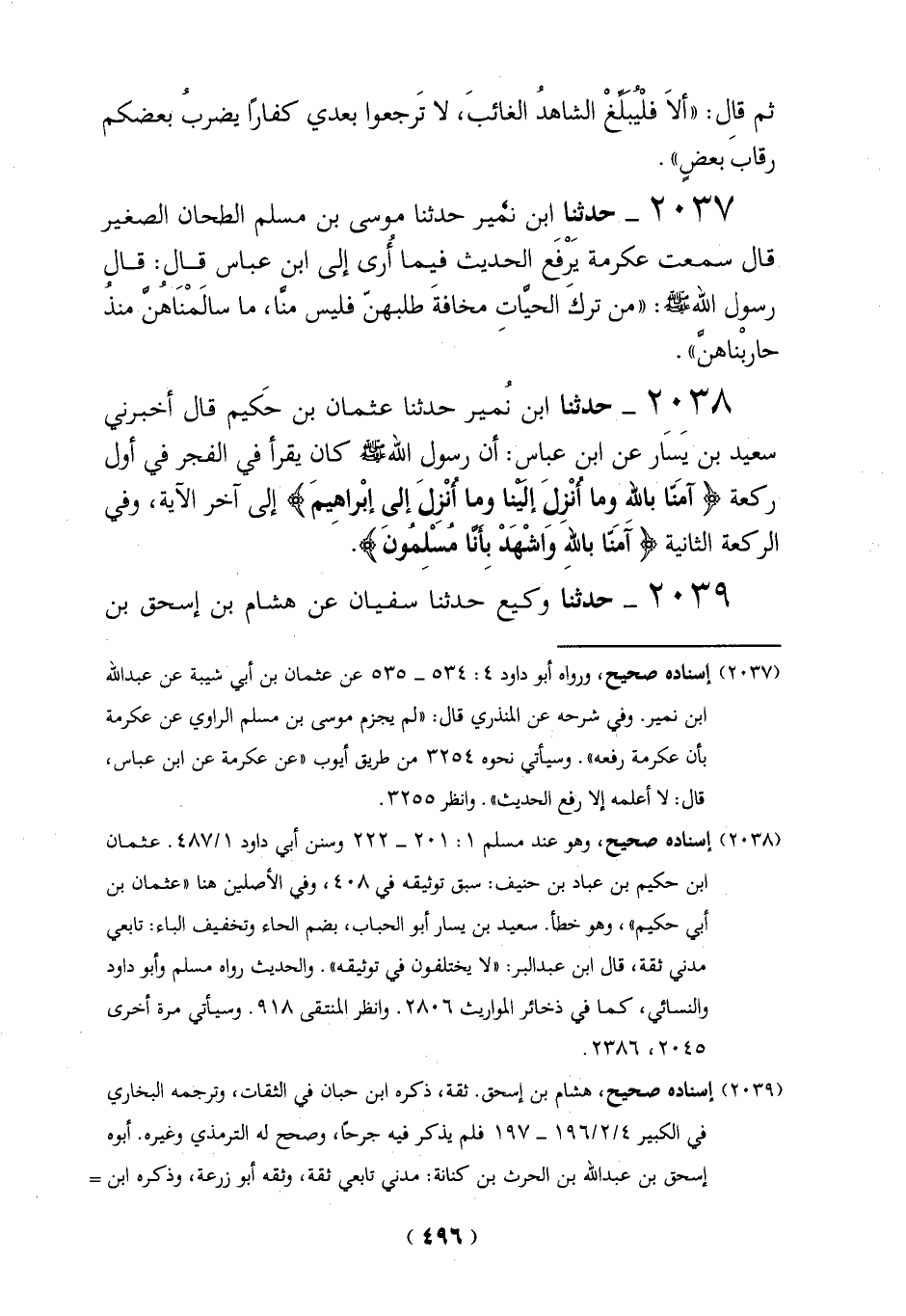 2038 - حدثنا ابن نمُير حدثنا عثمان بن حَكيم قال أخبرني سعيد بن يَسَار عن ابن عباس: أن رسول الله - صلى الله عليه وسلم - كان يقرأ في الفجر في أول ركعة {آمَنَّا بِاللَّهِ وَمَا أُنْزِلَ إِلَيْنَا وَمَا أُنْزِلَ إِلَى إِبْرَاهِيمَ} إلى آخر الآية، وفى الركعة الثانية {آمَنَّا بِاللَّهِ وَاشْهَدْ بِأَنَّا مُسْلِمُونَ}.