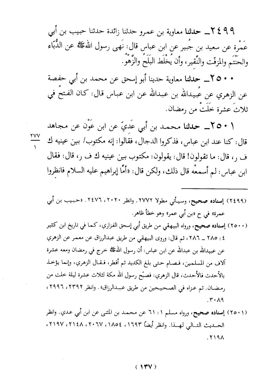2499 - حدثنا معاوية بن عمرو حدثنا زائدة حدثنا حبيب بن أبي عَمْرة عن سعيد بن جُبير في ابن عباس قال: نَهى رسول الله-صلي الله عليه وسلم- عن الدّبّاء والحَنْتَم والمزفّت والنَّقِير، وأن يُخْلَط البَلَحُ والزَّهْوُ.
