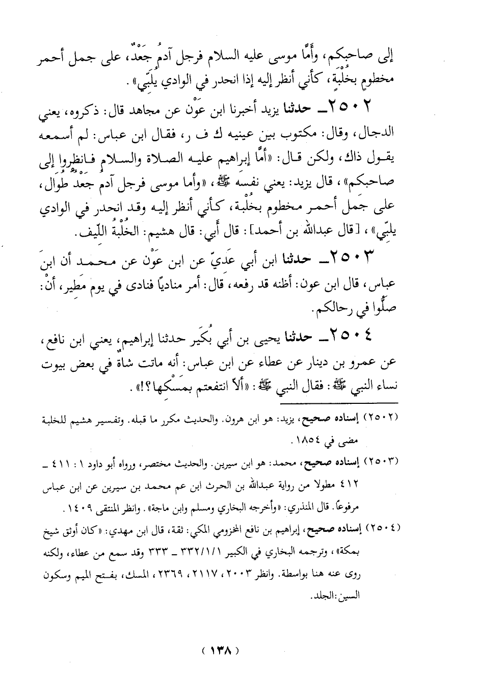 2502 - حدثنا يزيد أخبرنا ابن عوْن عن مجاهد قال: ذكروه، يعني الدجال، وقال: مكتوب بين عينيه ك ف ر، فقال ابن عباس: لم أسمعه يقول ذاك، ولكن قال: "أما إبرِاهيم عليه الصلاة والسلام فانظروا إلى صاحبكم"، قال يزيد: يعني نفسه - صلى الله عليه وسلم -، "وأما موسى فرجل آدم جَعْدُ طُوَال، على جَمل أحمر مخطوم بخلْبة، كأني انظر إليه وقد انحدر في الوادي يلبِّي"، [قال عبد الله بن أحمد]: قال أَبي: قال هُشيم: الخُلْبُة الِلّيف.