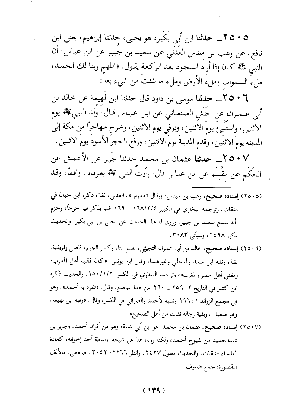 2506 - حدثنا موسى بن داود قال حدثنا ابن لَهِيعة عن خالد بن أبي عمران عن حَنَشٍ الصنعاني عن ابن عباس قال: وُلد النبي في يوم الاثنين، واستُنْبِئَ يومَ الاثنين، وتوفِي يوم الاثنين، وخرجِ مهاجِراً من مكة إلى المدينة يومَ الاثنين، وقدم المدينةَ يوم الاثنين، ورفَع الحجر الأسود يومَ الاثنين.