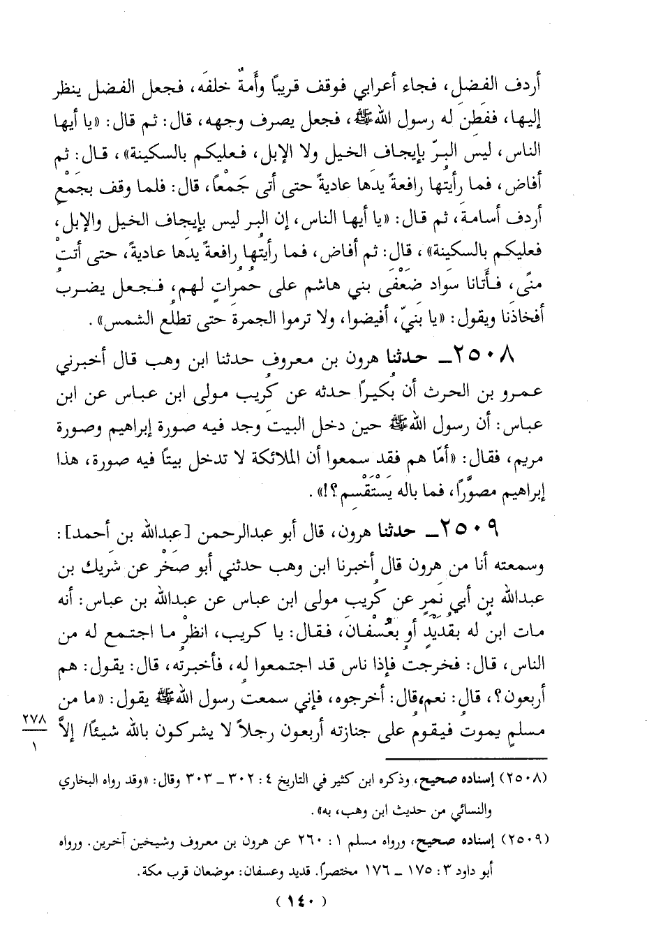 أردف الفضل، فجاء أعرابي فوقف قريباً وأَمةٌ خلفَه، فجعل الفضل ينظر إليها، ففَطنَ له رسول الله - صلى الله عليه وسلم -، فجعل يصرف وجهه، قال: ثم قال: "يا أيها الناس، ليسَ البرّ بإيجاف الخيل ولا الإبل، فعليكم بالسكينة"، قال: ثم أفاض، فما رِأيتُها رافعةً يدَها عاديةً حتى أتي جَمْعاً، قال: فلما وقف بجَمع أردف أسامة، تم قال: "يا أيها الناس، إن البر ليس بإيجاف الخيل والإبل، فعليكم بالسكينة"، قال: ثم أفاض، فما رأيتُها رافعةً يدَها عاديةً، حتى أتتْ منًى، فأَتانا سَواد ضَعْفَى بني هاشم على حُمُراتٍ لهم، فجعل يضرب أفخاذَنا ويقول: "يا بَني، أفيضوا، ولا ترموا الجمرةَ حتى تطلُع الشمس".