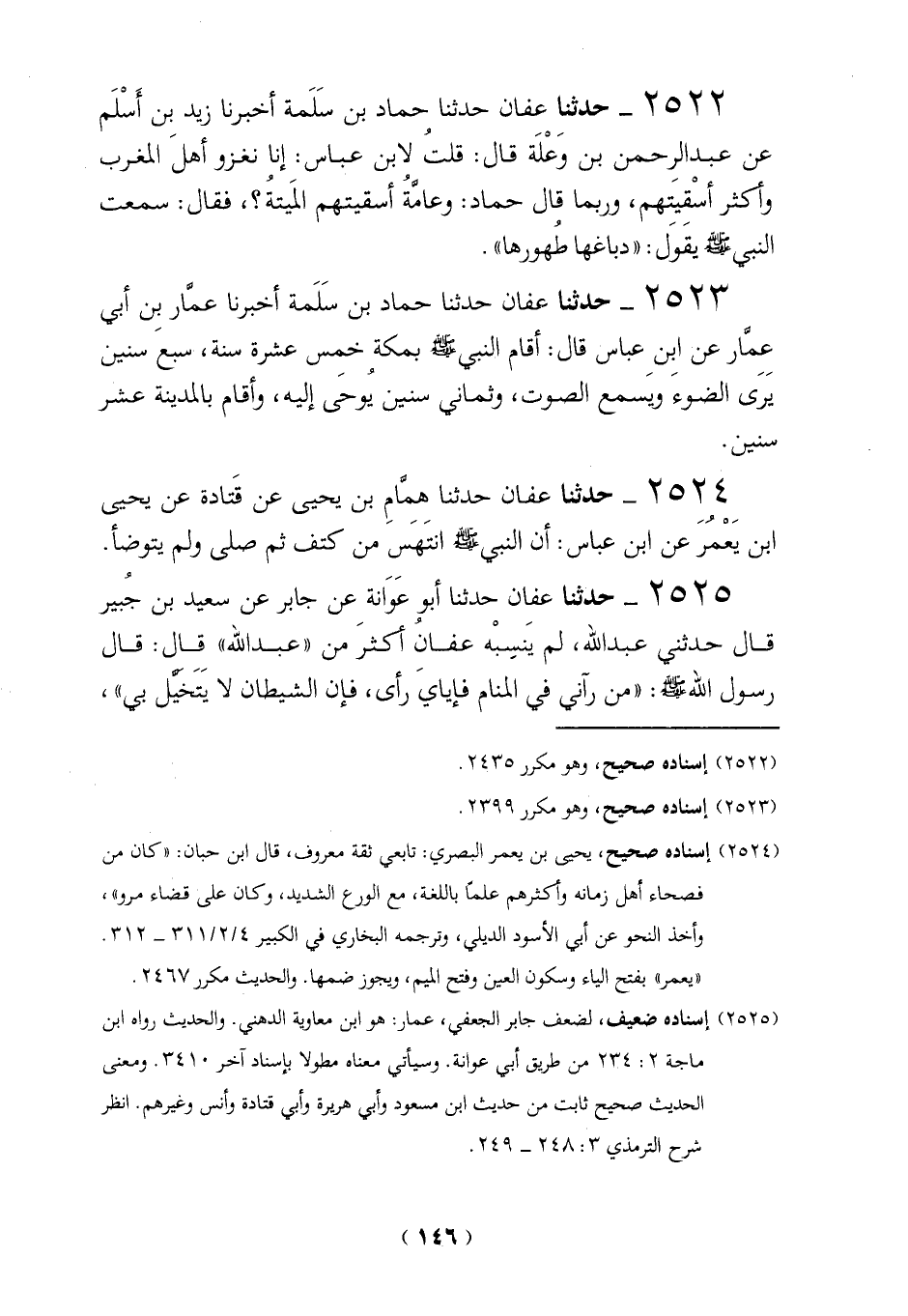 2523 - حدثنا عفان حدثنا حماد بن سَلَمة أخبرنا عمار بِن أبي عِمار عن ابن عباس قال: أقام النبي-صلي الله عليه وسلم- بمكة خمس عشرة سنة، سبع سنين يرى الضوءَ ويَسمع الصوت، وثماني سنين يُوحَى إليه، وأقام بالمدينة عشر سنين.