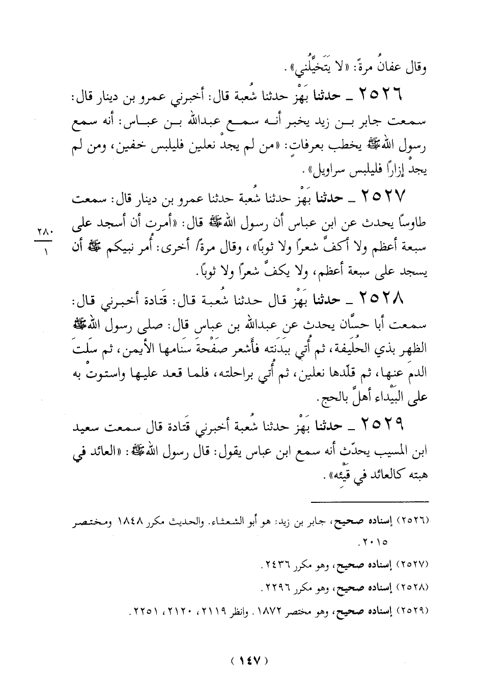2527 - حدثنا بَهْز حدثنا شُعبة حدثنا عمرو بن دينار قال: سمعت طاوساً يحدث عن ابن عباس أن رسول الله - صلى الله عليه وسلم - قال: "أمرت أن أسجد على سبعة أعظم ولا أكفَّ شعراً ولا ثوباً"، وقال مرةً أخرى: أُمر نبيكم - صلى الله عليه وسلم - أن يسجد على سبعة أعظم، ولايكفَّ شعرً أولا ثوباً.