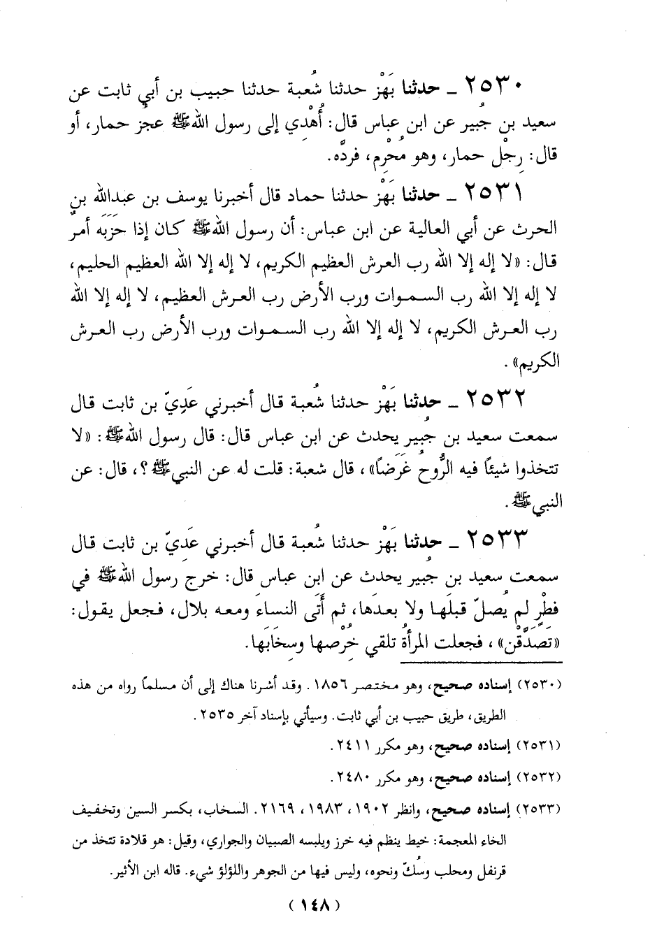 2530 - حدثنا بَهْز حدثنا شعبة حدثنا حبيب بن أبي ثابت عن سعيد بن جبير عن ابن عباس قال: أهْدِي إلى رسول الله - صلى الله عليه وسلم - عجُز حمار، أو قال: رِجْل حمار، وهو مُحرم، فردَّه.
