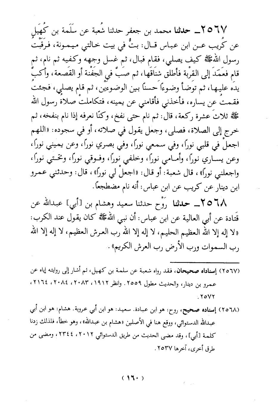 2567 - حدثنا محمد بن جعفرحدثنا شُعبة عن سَلَمة بن كُهَيل عن كُريب عن ابن عباس قال: بتُّ في بيت خالتي ميمونة فرَقَبْتُ رسول الله -صلي الله عليه وسلم- كيف يصلي، فقام فبال، ثمِ غسل وجهه وكفيه ثم نام، ثم قام فعَمَدَ إلى القِرْبة فأطلق شنَاقَها، ثم صَبَّ في الجَفْنة أو القَصعة، وأكبَّ