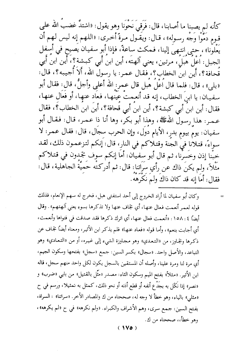 = وكان أبو سفيان لما أراد الخروج إلى أحد استفتى هبل، فخرج له سهم الإنعام، فذلك قوله لحمر أنعمت فعال عنها، أي تجاف عنها ولا تذكرها بسوء يعني آلهتهم". وقال أيضاً 4: 158: "أنعمت فعال عنها، أي اترك ذكرها فقد صدقت في فتواها وأنعمت، أي أجابت بنعم"، وأما قوله "فعاد عنها" فلم يذكر ابن الأثير، ومعناه أيضاً تجاف عن ذكرها وتجاوز، من "التعدي" وهو مجاوزة الشيء إلى غيره، أو من "التعادي" وهو التباعد، والأصل واحد. "سجال" بكسر السين: جمع "سجل" بفتحها وسكون الجيم، أي مرة لنا ومرة علينا، وأصله أن المستقين بالسجل يكون لكل واحد منهم سجل، قاله ابن الأثير. "مثلاً" بفتح الميم وسكون الثاء: مصدر "مثل بالقتيل" من بابي "ضرب" و "نصر" إذا نَكّل به بجَدْع أنفه أو قطع أذنه أو نحو ذلك، كمثل به تمثيلا، ورسم في ح "مثلي" بالياء، وهو خطأ لا وجه له، صححناه من ك والصادر الآخر. "سراتنا": السراة، بفتح السين: جمع سرى، وهم الأشراف والكبراء. "ولم نكرهه" في ح "لم يكرهه"، وهو خطأ،، صححناه من ك.