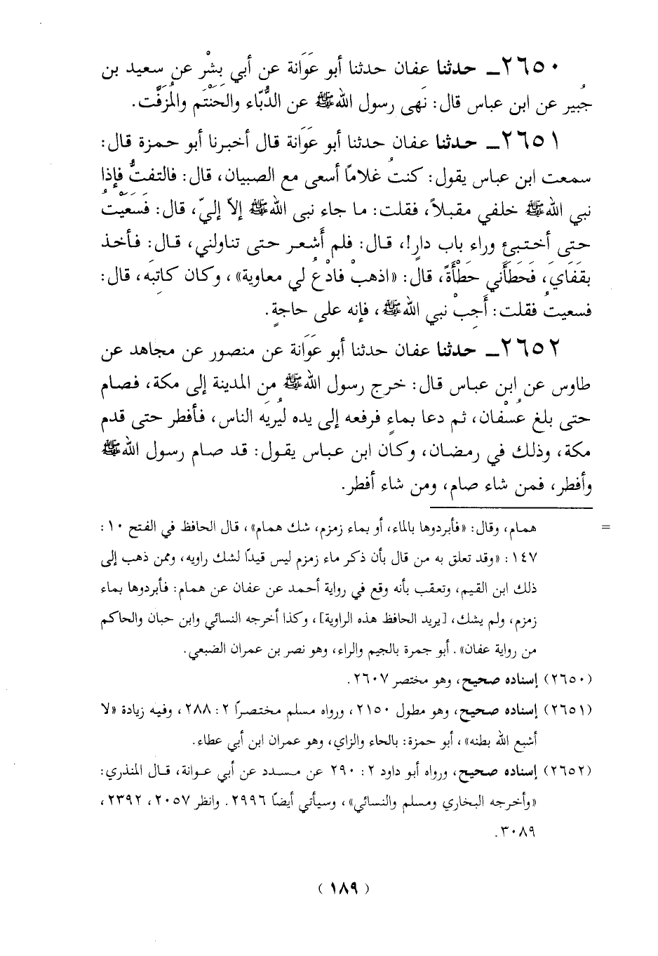 2651 - حدثنا عفان حدثنا أبو عَوَانة قال أخبرنا أبو حمزة قال: سمعت ابن عباس يقول: كنتُ غلاماً أسعى مع الصبيان، قال: فالتفتُّ فإذا نبي الله - صلى الله عليه وسلم - خلفي مقبلاً، فقلت: ما جاء نبي الله-صلي الله عليه وسلم- إلاَّ إليّ، قال: فَسَعيتُ حتى أختبئِ وراء باب دارٍ!، قال: فلم أَشعر حتى تناولني، قال: فأخذ بقَفَايَ فَحَطاني حَطْأَةً، قال: "اذهبْ فادْعُ لي معاوية"، وكان كاتِبَه، قال: فسعيتُ فقلت: أَجِبْ نبي الله -صلي الله عليه وسلم-، فإنه على حاجةٍ.