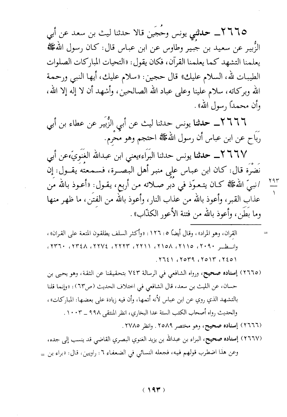 (2665) إسناده صحيح، ورواه الشافعي في الرسالة 743 بتحقيقنا عن الثقة، وهو يحيى بن حسان، عن الليث بن سعد، قال الشافعي في اختلاف الحديث (ص 63): "وإنما قلنا بالتشهد الذي روي عن ابن عباس لأنه أتمها، وأن فيه زيادة على بعضها: المباركات"، والحديث رواه أصحاب الكتب الستة عدا البخاري، انظر المنتقى 998 - 1003.
