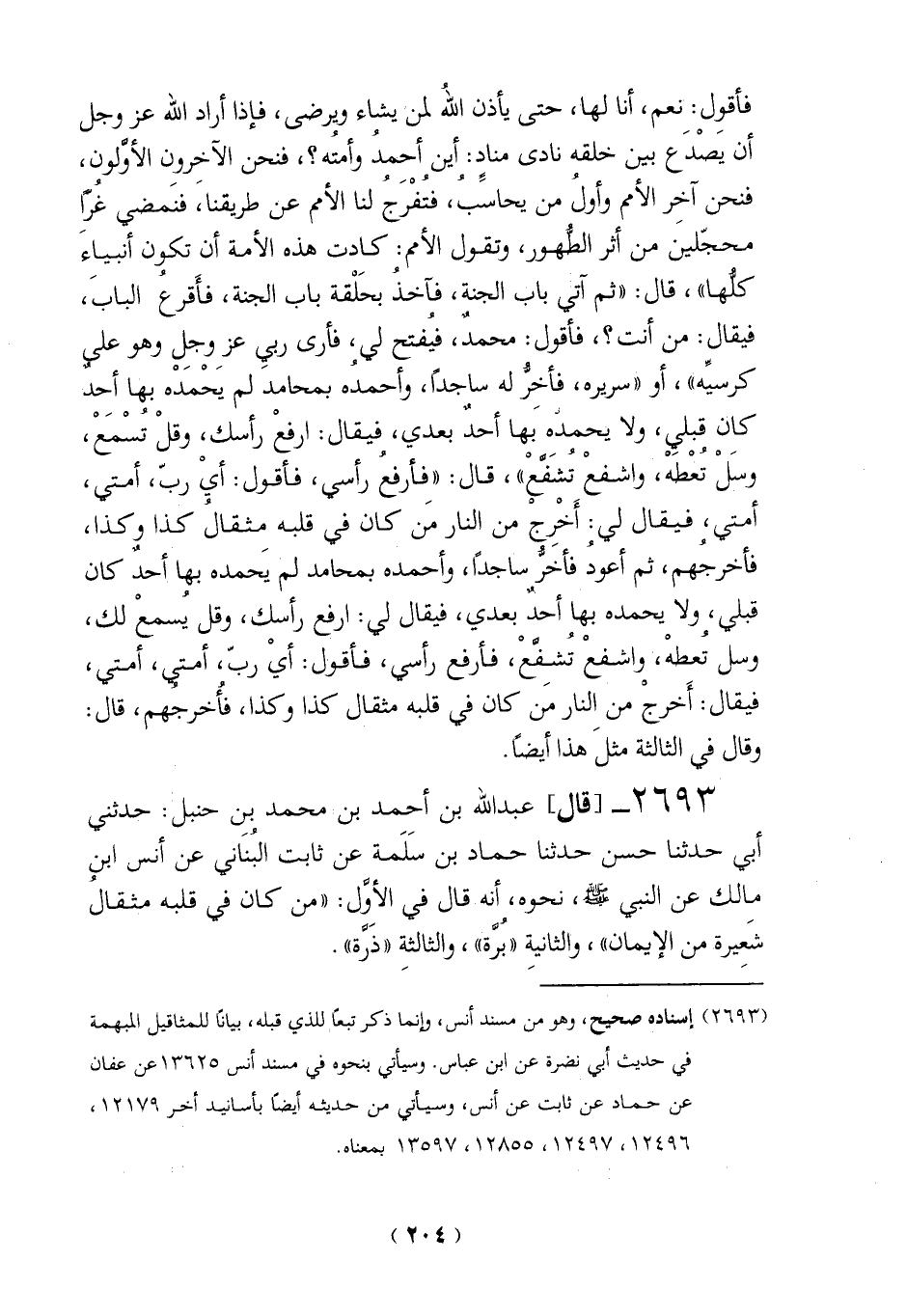 2693 - [قال] عبد الله بن أحمد بن محمد بن حنبل: حدثني أبي حدثنا حسن حدثنا حماد بن سَلَمة عن ثابت البُنَاني عن أنس ابن مِالك عن النبي - صلى الله عليه وسلم -، نحوه، أنه قال في الأول: "من كان في قلبه مثقال شعِيرة من الإيمان"، والثانيةِ "بُرَّة"، والثالثةِ "ذَرَّة".