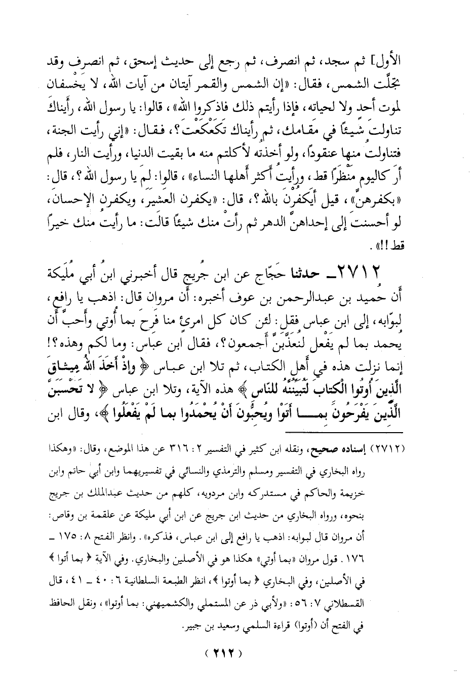 2712 - حدثنا حَجّاج عن ابن جُريج قال أخبرني ابنُ أبي مُلَيكة أَن حميد بن عبد الرحمن بن عوف أخبره: أَن مرواِن قِال: اذهب يا رافع، لبوّابه، إلى ابن عباس فقلِ: لئن كان كل امرئٍ منا فرِح بما ُأوتى وأَحبَّ أَن يُحمد بما لم يَفْعل لنُعَذَّبَنَّ أَجمعون؟، فقال ابن عباس: وما لكم وهذه؟! إنما نزلت هذه في أَهل الكتاب، ثم تلا ابن عباس {وَإِذْ أَخَذَ اللَّهُ مِيثَاقَ الَّذِينَ أُوتُوا الْكِتَابَ لَتُبَيِّنُنَّهُ لِلنَّاسِ} هذه الآية، وتلا ابن عباس {لَا تَحْسَبَنَّ الَّذِينَ يَفْرَحُونَ بِمَا أَتَوْا وَيُحِبُّونَ أَنْ يُحْمَدُوا بِمَا لَمْ يَفْعَلُوا} , وقال ابن
