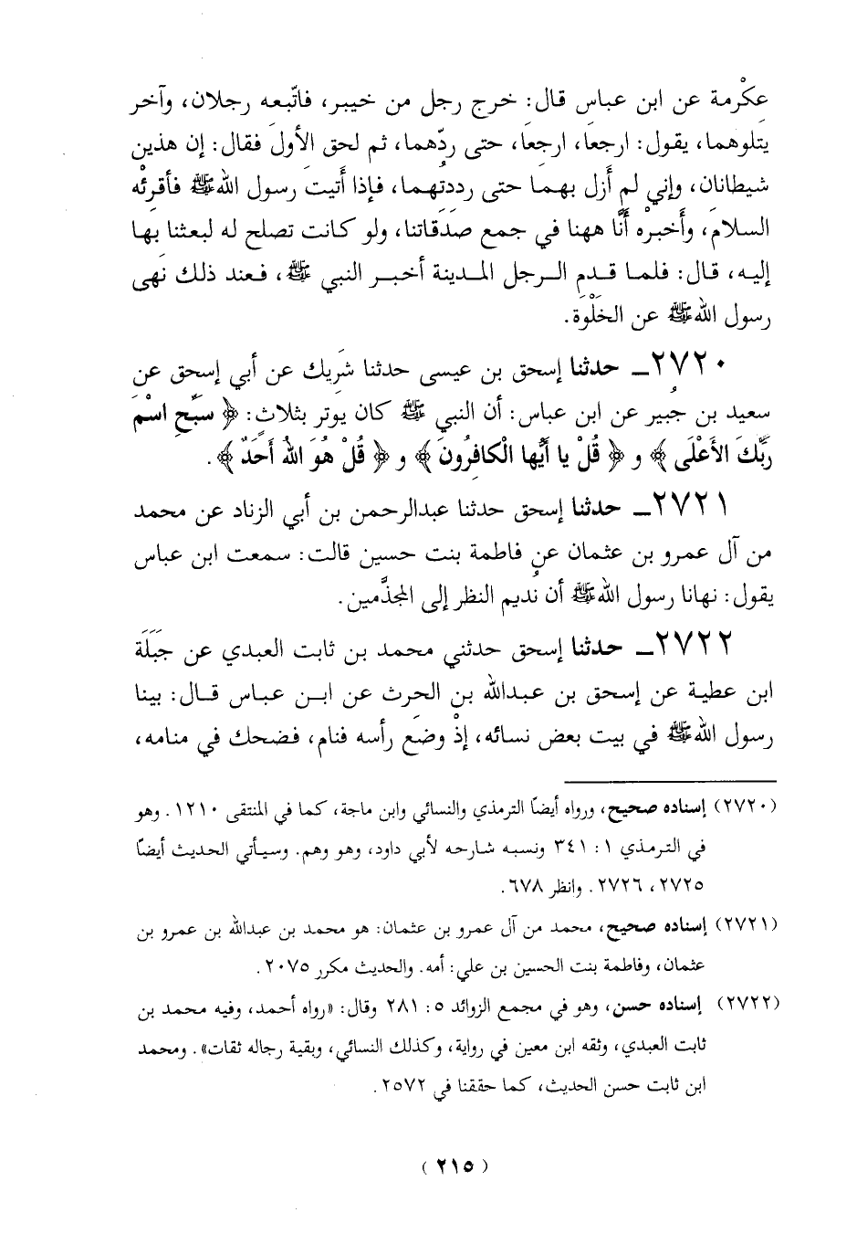 2720 - حدثنا إسحق بن عيسى حدثنا شَرِيك عن أبي إسحق عن سعيد بن جُبير عن ابن عباس: أن النبي - صلى الله عليه وسلم - كان يوتر بثلاثِ: {سَبِّحِ اسْمَ رَبِّكَ الْأَعْلَى (1)} و {قُلْ يَا أَيُّهَا الْكَافِرُونَ (1)} و {قُلْ هُوَ اللَّهُ أَحَدٌ (1)}