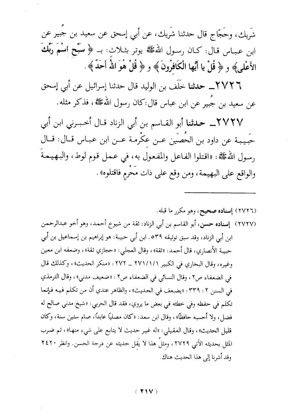2727 - حدثنا أبو القاسم بن أبي الزناد قال أخبرني ابن أبي حَبيبة عن داود بن الحُصمَين عن عكْرمة عن ابن عباس قال: قال رسول الله - صلى الله عليه وسلم -: "اقتلوا الفاعل والمفعوَل به، في عمل قوم لوط، والبهيمةَ والواقع على البهيمة، ومن وقع على ذات مَحْرمِ فاقتلوه".