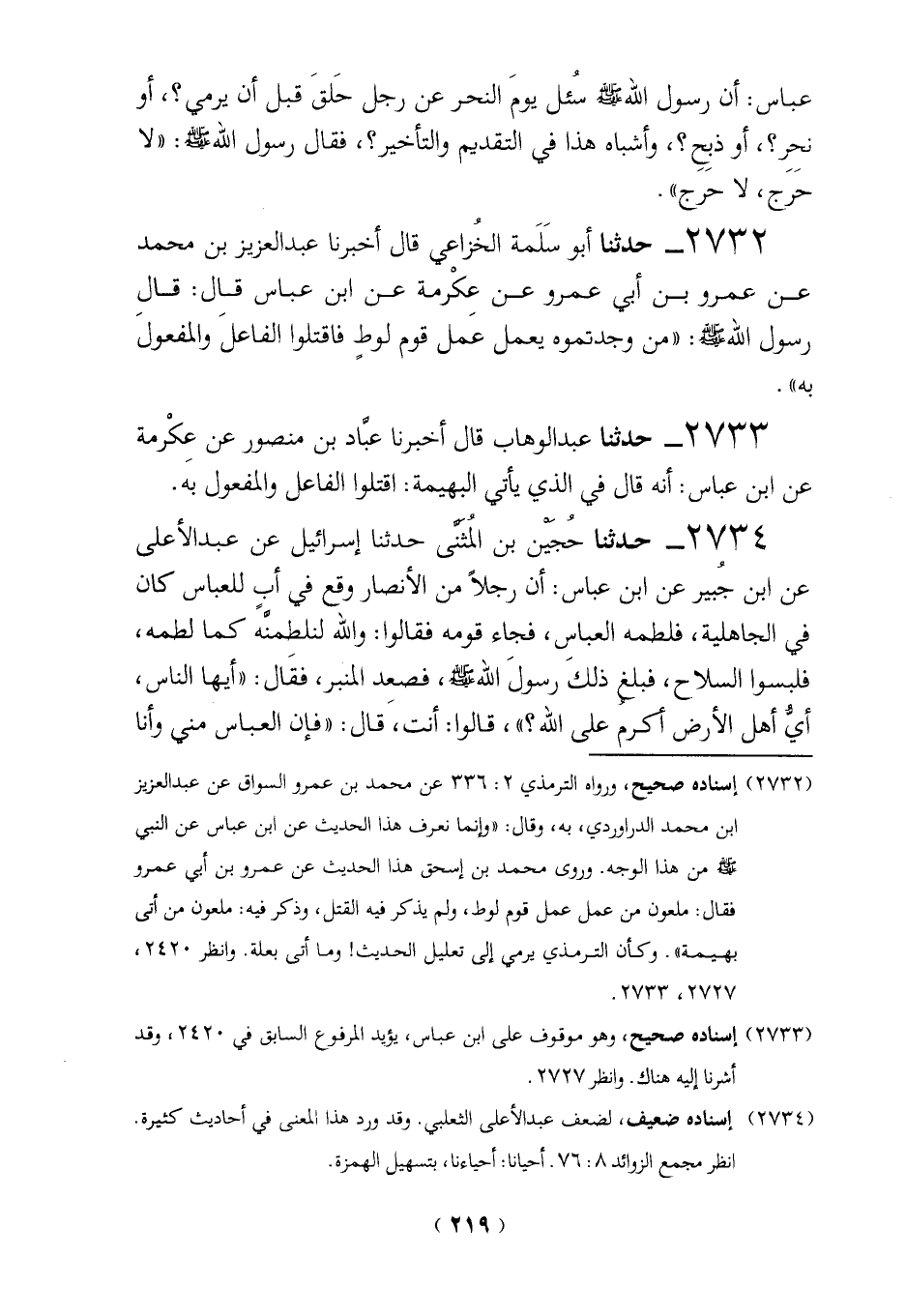 (2732) إسناده صحيح، ورواه الترمذي 2: 336 عن محمد بن عمرو السواق عن عبد العزيز ابن محمد الدراوردي، به، وقال: "وإنما نعرف هذا الحديث عن ابن عباس عن النبي - صلى الله عليه وسلم - من هذا الوجه. وروى محمد بن إسحق هذا الحديث عن عمرو بن أبي عمرو فقال: ملعون من عمل عمل قوم لوط، ولم يذكر فيه القتل، وذكر فيه: ملعون من أتى بهيمة". وكأن الترمذي يرمي إلى تعليل الحديث! وما أتى بعلة. وانظر 2420.