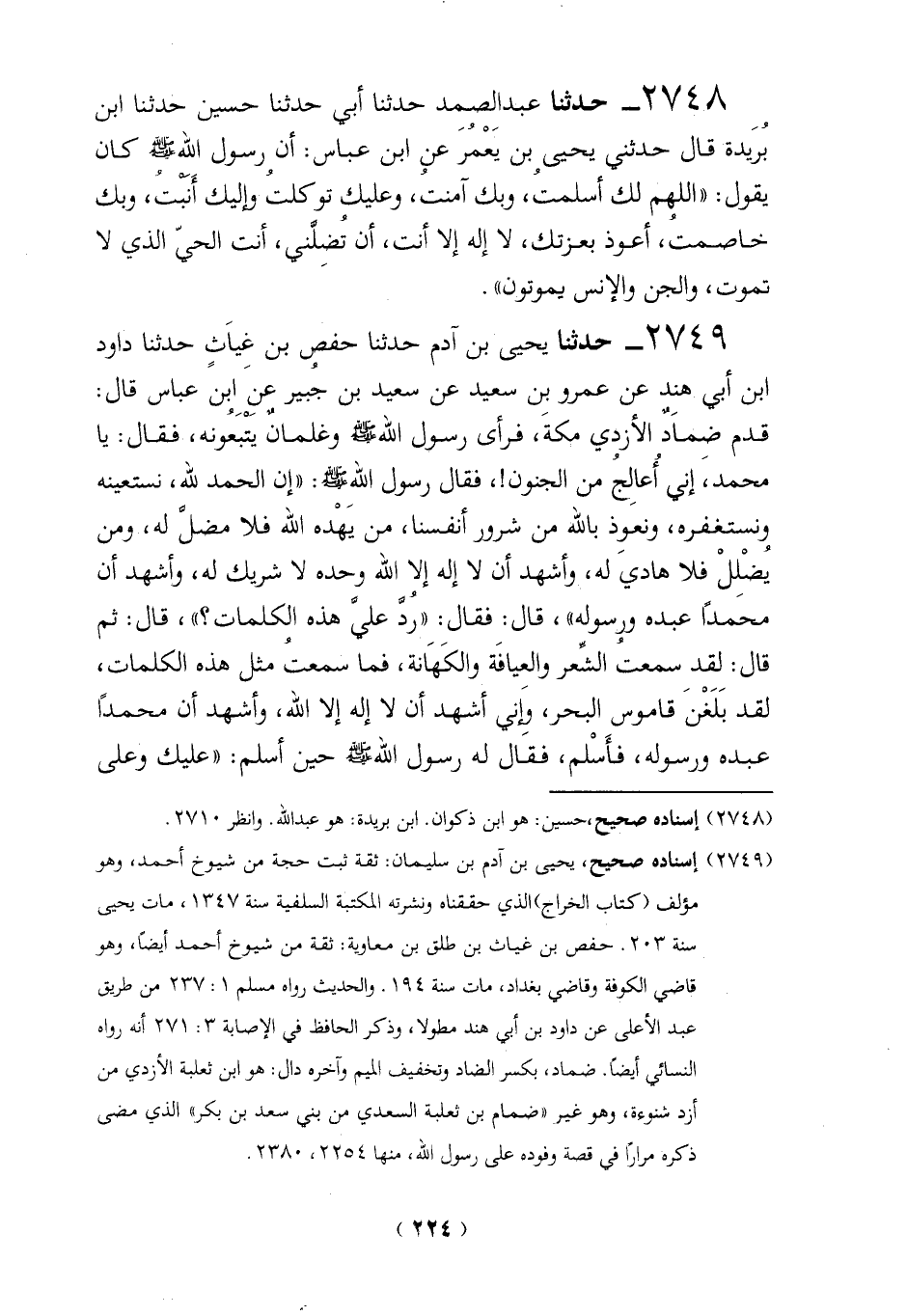 (2749) إسناده صحيح، يحيى بن آدم بن سليمان: ثقة ثبت حجة من شيوخ أحمد، وهو مؤلف (كتاب الخراج) الذي حققناه ونشرته المكتبة السلفية سنة 1347، مات يحيى سنة 203. حفص بن غياث بن طلق بن معاوية: ثقة من شيوخ أحمد أيضاً، وهو قاضي الكوفة وقاضي بغداد، مات سنة 194. والحديث رواه مسلم 1: 237 من طريق عبد الأعلى عن داود بن أبي هند مطولاً، وذكر الحافظ في الإصابة 3: 271 أنه رواه النسائي أيضاً. ضماد، بكسر الضاد وتخفيف الميم وآخره دال: هو ابن ثعلبهَ الاُزدي من أزد شنوءة، وهو غير "ضمام بن ثعلبة السعدي من بني سعد بن بكر" الذي مضى ذكره مراراً في قصة وفوده على رسول الله، منها 2254، 2380.