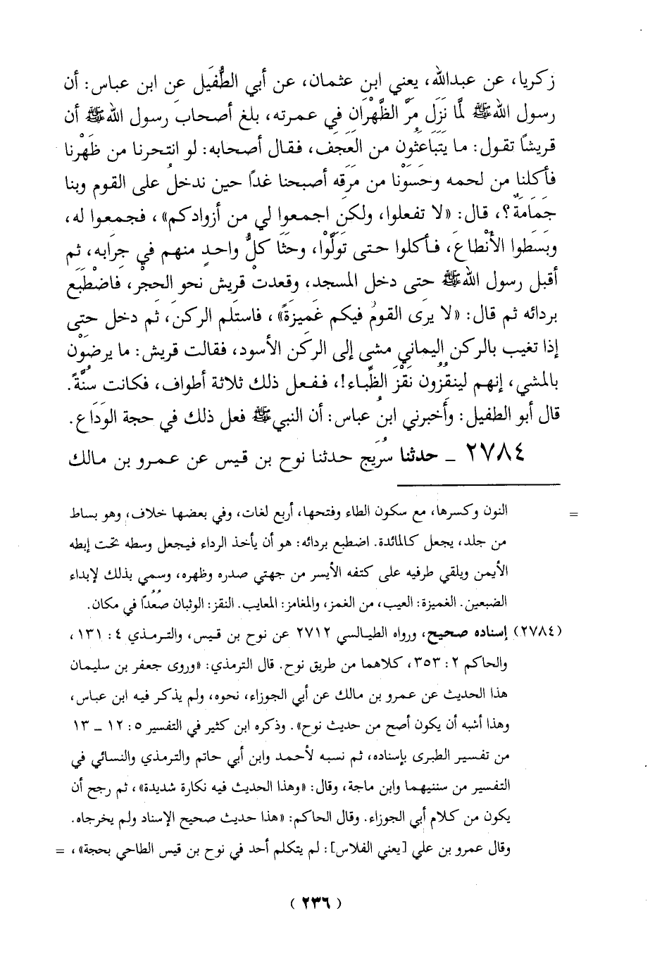 زكريا، عن عبد الله، يعني ابن عثمان، عن أبي الطُّفَيل عِن ابن عباس: أن رسول الله - صلى الله عليه وسلم - لمَّا نَزَل مر الظَّهْرَان في عمرته، بلغ أصحاب رسول الله - صلى الله عليه وسلم - أن قريشاً تقول: ما يَتَبَاعَثُوِن من الَعَجف، فقال أصحابه: لو انتحرنا من ظَهْرنا فأكلنا من لحمه وحَسَوْنا من مَرَقه أصبحنا غداً حين ندخلُ على القوم وبنا جَمَامَةٌ؟، قال: "لا تفعلوا، ولكنَ اجمعوا لي من أزوادكم"، فجمعوا له، وبَسَطوا الأنْطاعَ، فأكلوا حتى تَوَلَّوْا، وحَثَا كلُّ واحدٍ منهم في جرَابه، ثم أقبل رسول الله - صلى الله عليه وسلم - حِتى دخل المسجد، وقعدتْ قريش نحو الحجْر، فَاضْطَبَع بردائه ثم قال: "لا يرى القوم فيكم غَميزَةً"، فاستَلم الركنَ، ثَم دخل حِتى إذا تغيب بالركن اليماني إلى الركَن الأسود، فقالت قريش: ما يرضون بالمشى، إنهم لينقُزُون نقْز الظِّباء!، ففعل ذلك ثلاثة أطواف، فكانت سُنةً.