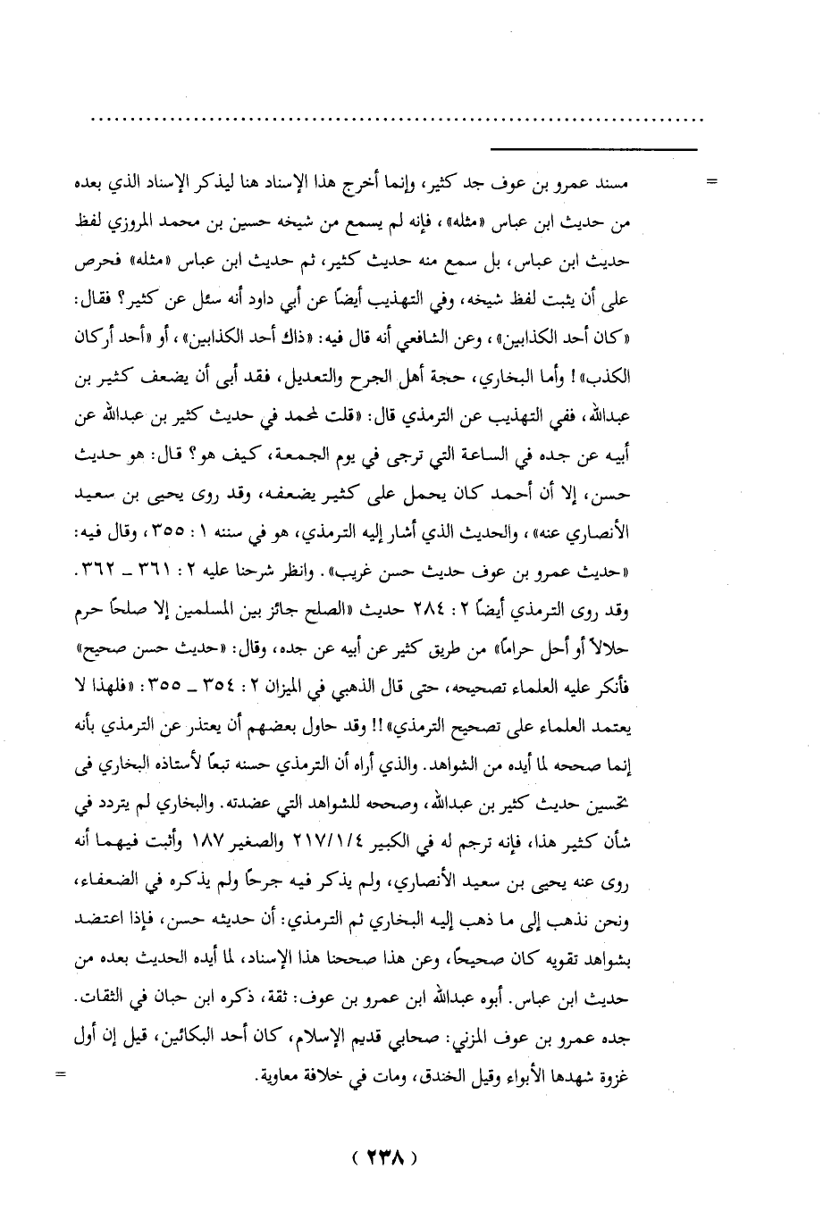 وقد روى الترمذي أيضاً2: 284 حديث "الصلح جائز بين المسلمين إلا صلحاً حرم حلالاً أوأحل حراماً" من طريق كثير عن أبيه عن جده، وقال: "حديث حسن صحيح" فأنكر عليه العلماء تصحيحه، حتى قال الذهبي في الميزان 2: 354 - 355: "فلهذا لا يعتمد العلماء على تصحيح الترمذي"!! وقد حاول بعضهم أن يعتذر عن الترمذي بأنه إنما صححه لما أيده من الشواهد. والذي أراه أن الترمذي حسنه تبعاً لأستاذه البخاري في تحسين حديث كثير بن عبد الله، وصححه للشواهد التي عضدته. والبخاري لم يتردد في شأن كثير هذا، فإنه ترجم له في الكبير 4/ 1/ 217 والصغير 187 وأثبت فيهما أنه روى عنه يحيى بن سعيد الأنصاري، ولم يذكر فيه جرحاً ولم يذكره في الضعفاء، ونحن نذهب إلى ما ذهب إليه البخاري ثم الترمذي: أن حديثه حسن، فإذا اعتضد بشواهد تقويه كان صحيحاً، وعن هذا صححنا هذا الإسناد، لما أيده الحديث بعده من حديث ابن عباس. أبوه عبد الله ابن عمرو بن عوف: ثقة، ذكره ابن حبان في الثقات.