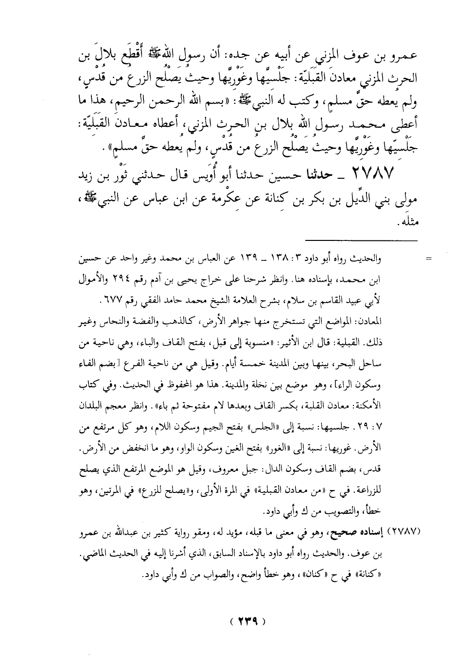 عمرو بن عوف المزني عن أبيه عن جده: أن رسول الله - صلى الله عليه وسلم - أَقْطعَ بلالَ بن الحرث المزنى معادنَ القبَليّة: جَلْسيَّها وغَوْرِيَّها وحيثُ يَصْلُح الزرع من قُدْسٍ، ولم يعطه حقَّ مسلمٍ، وكتب له اَلنبي - صلى الله عليه وسلم -: "بسم الله الرحمن الرحيمِ، هذا ما أعطى محمد رسول الله بلال بن الحرث المزني، أعطاه معادن القَبَليّة: جَلْسيّها وغَوْرِيَّها وحيثُ يَصْلُح الزرع من قُدْسٍ، ولم يُعطه حقَّ مسلمٍ".