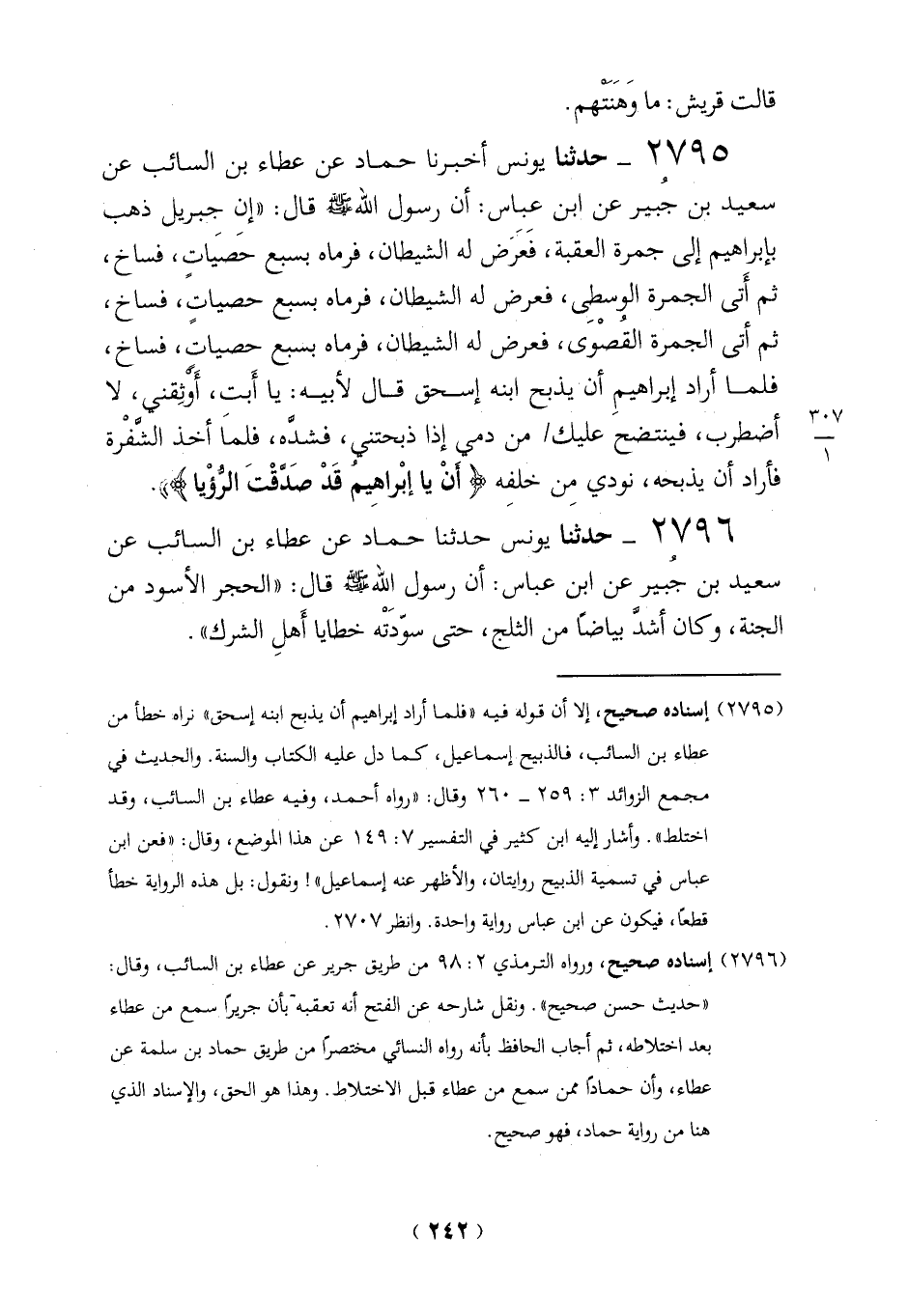 2795 - حدثنا يونس أخبرنا حماد عن عطاء بن السائب عن سعيد بن جُبير عن ابن عباس: أن رسول الله-صلي الله عليه وسلم- قال: "إن جبريل ذهب بإبراهيم إلى جمرة العقبة، فَعَرَض له الشيطان، فرماه بسبع حَصَياتٍ، فساخ، ثم أَتى الجمرة الوسطى، فعرض له الشيطان، فرماه بسبع حصيات، فساخ، ثم أتى الجمرة القُصْوَى، فعرض له الشيطان، فرماه بسبع حصيات، فساخ،