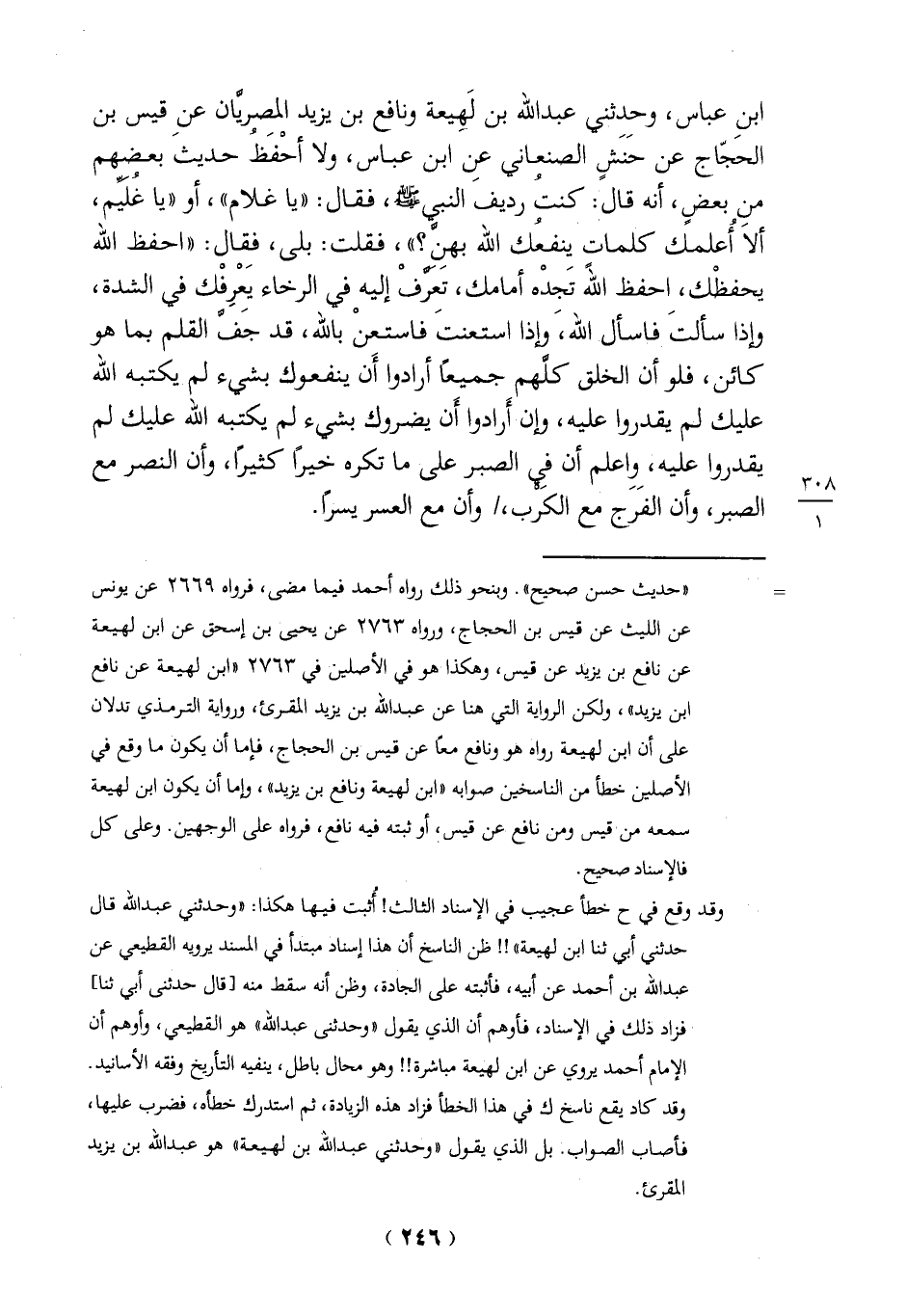 ابنِ عباس، وحدثني عبد الله بن لَهيعة ونافع بن يزيد المصريان عنِ قيس بن الحجّاج عن حَنَشٍ الصنعاني عنِ ابن عباس، ولا أحْفَظُ حديث بعضهم منِ بعضٍ، أنه قال: كنتُ رديف النبي - صلى الله عليه وسلم -، فقال: "يا غلام"، أو "يا غُليم، ألا أُعلمك كلمات ينفعُك الله بهنَّ؟ "، فقلت: بلى، فِقال: "احفظ الله يحفظْك، احفظ الله تَجدْه أمامك، تَعَرَّف إليه في الرخاء يَعْرِفْك في الشدة، وإذا سألتَ فاسأل الله، وإذا استعنتَ فاستعنْ بالله، قد جَفَّ القلم بما هو كائن، فلو أن الخلق كلهم جميعاً أرادوا أَن ينفعوك بشيء لم يكتبه الله عليك لم يقدروا عليه، وإن أَرادوا ان يضروك بشيء لم يكتبه الله عليك لم يقدروا عليه، واعلم أن فِي الصبر على ما تكره خيراً كثيراً، وأن النصر مع الصبر، وأن الفَرَج مع الكَرْب،/وأن مع العسر يسراً.