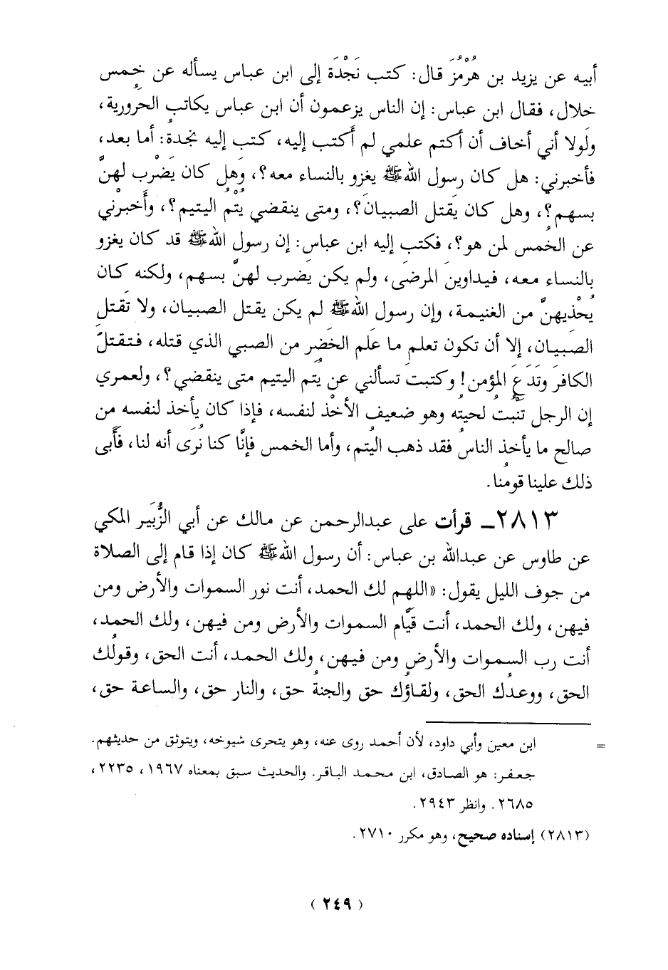 2813 - قرأت على عبد الرحمن عن مالك عن أبي الزُّبَير المكي عن طاوس عن عبد الله بن عباس: أن رسول الله - صلى الله عليه وسلم - كان إذا قام إلى الصلاة من جوف الليل يقول: "اللهم لك الحمد، أنت نور السموات والأرض ومن فيهن، ولك الحمد، أنت قيام السموات والأرض ومن فيهن، ولك الحمد، أنت رب السموات والأرض ومن فيهن، ولك الحمد، أنت الحق، وقولك الحق، ووعدك الحق، ولقاؤك حق والجنة حق، والنار حق، والساعة حق،