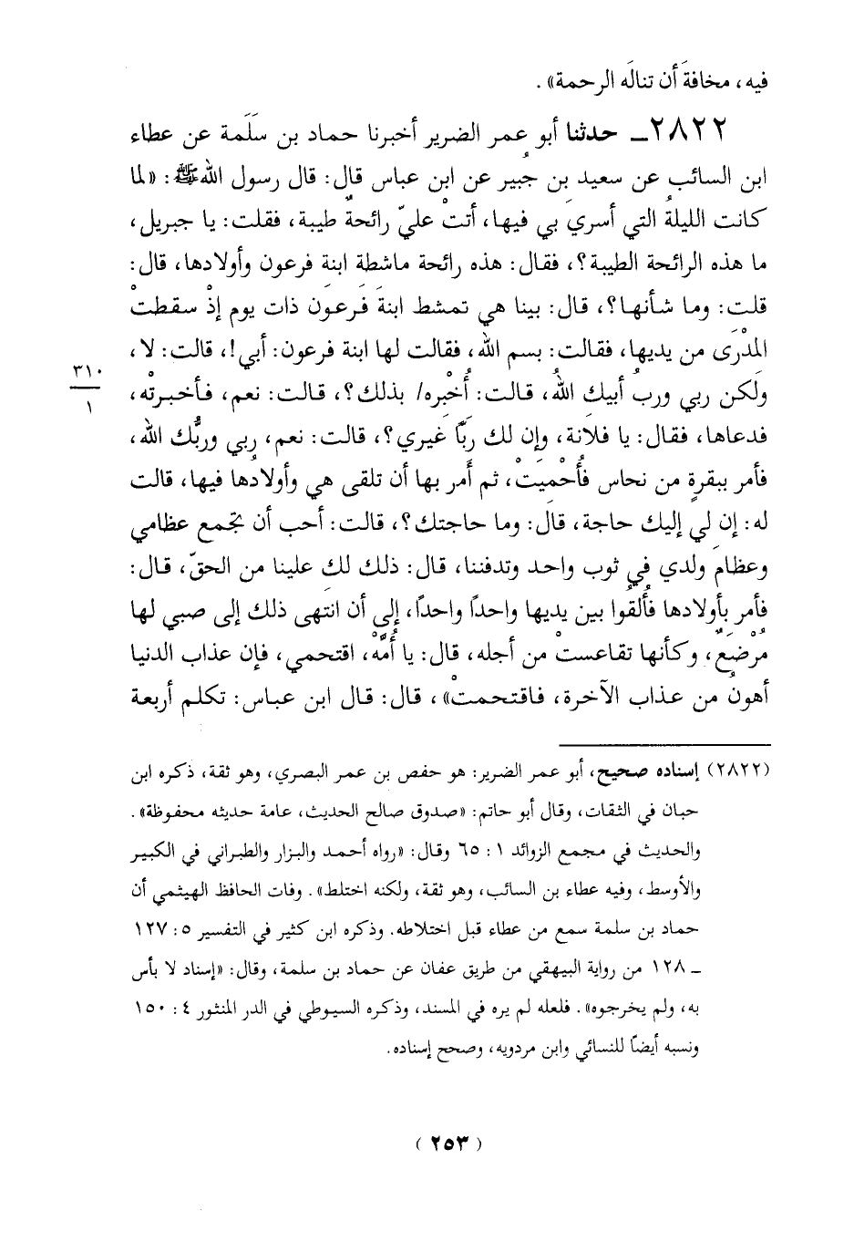 2822 - حدثنا أبو عمر الضرير أخبرنا حماد بن سَلَمة عن عطاء ابن السائب عن سعيد بِن جُبير عن ابن عباس قال: قال رسول الله - صلى الله عليه وسلم -: "لما كانت الليلةُ التي أسري بي فيها، أتتْ على رائحةٌ طيبة، فقلت: يا جبريل، ما هذه الرائحة الطيبة؟، فقال: هذه رائحة ماشطةِ ابنةِ فرعون وأولادها، قال: قلت: وما شأنها؟، قال: بينا هي تمشط ابنةَ فرعون ذات يوم إذْ سقطتْ المدْرَى من يديها، فقالت: بسم الله، فقالت لها ابنة فرعون: أبي!، قالت: لا، وَلكن ربي ورب أبيك الله، قالت: أُخْبِره بذلك؟، قالت: نعم، فأخبرتْه، فدعاها، فقال: يا فلاَنة، وِإن لك رَباً غيري؟، قالت: نعم، ربي وربُّك الله، فأمر ببقرةٍ: من نحاس فأُحْميَتْ، ثم أَمر بها أن تلقى هي وأولادُها فيها، قالت له: إن لي إليك حاجة، قالَ: وما حاجتك؟، قالت: أحب أن تجمع عظامي وعظامَ ولدي في ثوب واحد وتدفننا، قال: ذلك لك علينا من الحق، قال: فأمر بِأولادها فأُلقوا بين يديها واحداً واحداً، إلى أن انتَهى ذلك إلى صبي لها مُرْضعٌ، وكأنها تقاعستْ من أجله، قال: يا أُمَّه، اقتحمي، فإن عذاب الدنيا أهونُ من عذاب الآخرة، فاقتحمتْ"، قال: قال ابن عباس: تكلم أربعة