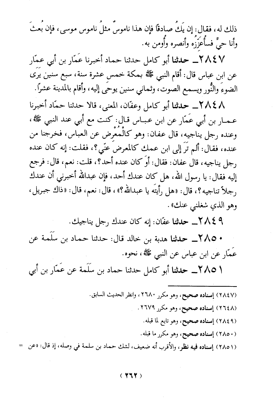 2848 - حدثنا أبو كامل وعفّان، المعنى، قالا حدثنا حمّاد أخبرنا عمار بن أبي عَمّارعن ابن عباس قال: كنت مع أبي عند النبي - صلى الله عليه وسلم -، وعنده رجل يناجيه، قال عفان: وهو كالْمُعْرِض عن العباس، فخرجنا من عنده، فقال: ألم تَرَ إلى ابن عمك كالمعرض عنّي؟، فقلت: إنه كان عنده رجل يناجيه، قال عفان: فقال: أوَ كان عنده أحد؟، قلت: نعم، قال: فرجع إليه فقال: يا رسول الله، هل كان عندك أحد، فإن عبد الله أخبرني أن عندك رجلاً تناجيه؟، قال: "هل رأيتَه يا عبد الله؟ "، قال: نعم، قال: "ذاك جبريل، وهو الذي شغلني عنك".