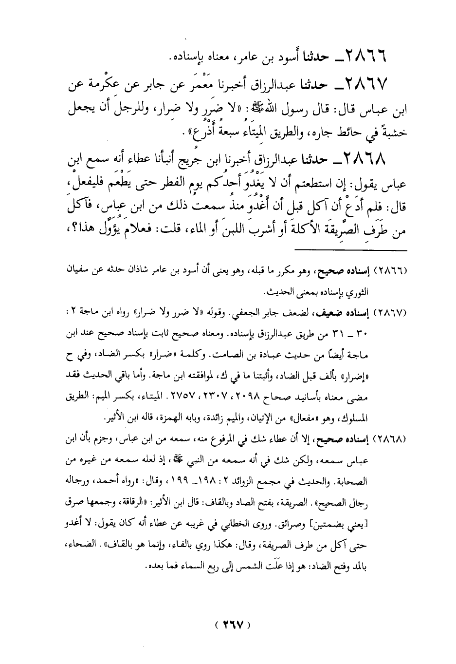(2867) إسناده ضعيف، لضعف جابر الجعفي. وقوله "لا ضرر ولا ضرار" رواه ابن ماجة 2: 30 - 31 من طريق عبد الرزاق بإسناده. ومعناه صحيح ثابت بإسناد صحيح عند ابن ماجة أيضاً من حديث عبادة بن الصامت. وكلمة "ضرار" بكسر الضاد، وفي ح "إضرار، بألف قبل الضاد، وأثبتنا ما في ك، لموافقته ابن ماجة. وأما باقي الحديث فقد مضى معناه بأسانيد صحاح 2098، 2307، 2757. الميتاء، بكسر اليم: الطريق المسلوك، وهو "مفعال" من الإتيان، واليم زائدة، وبابه الهمزة، قاله ابن الأثير.