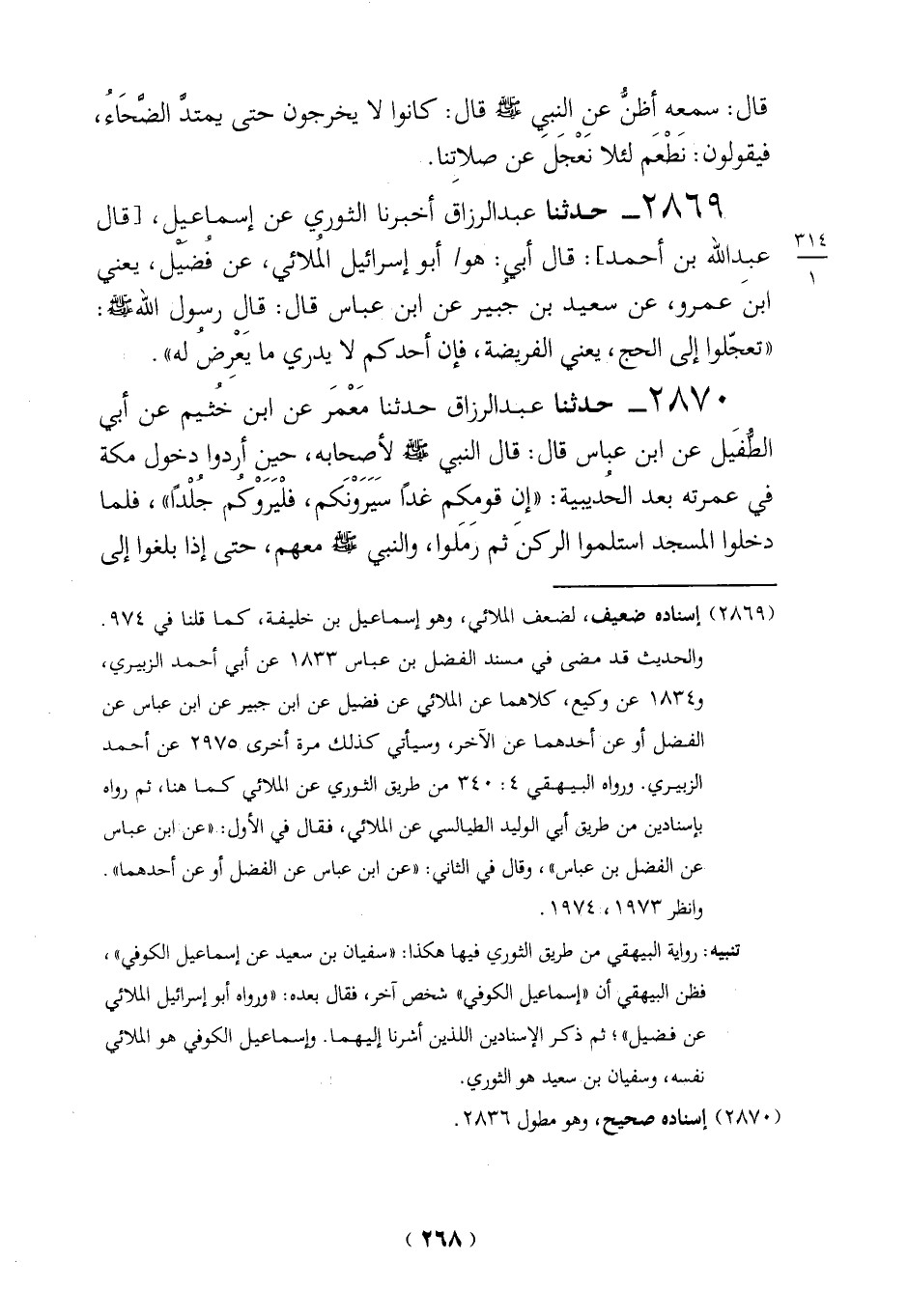 2869 - حدثنا عبد الرزاق أخبرنا الثوري عن إسماعيل، [قال عبد الله بن أحمد]: قال أبي: هو أبو إسرائيل المُلائى، عن فُضيْل، يعني ابنَ عمرو، عن سعيد بن جُبير عن ابن عباس قال: قالِ رسول الله - صلى الله عليه وسلم -: "تعجّلوا إلى الحج، يعني الفريضة، فإن أحدكم لا يدري ما يَعْرِضُ له". 2870 - حدثنا عبد الرزاق حدثنا مَعْمَر عن ابن خُثيم عن أبي الطُّفَيل عن ابن عباس قال: قال النبي - صلى الله عليه وسلم - لأصحابه، حين أردوا دخول مكة في عمرته بعد الحُديبية: "إن قومكم غداً سَيَرَوْنَكم، فلْيَرَوْكُم جُلْداً"، فلما دخلوا المسجد استلموا الركنَ ثم رَمَلوا، والنبي - صلى الله عليه وسلم - معهم، حتى إذا بلغوا إلى