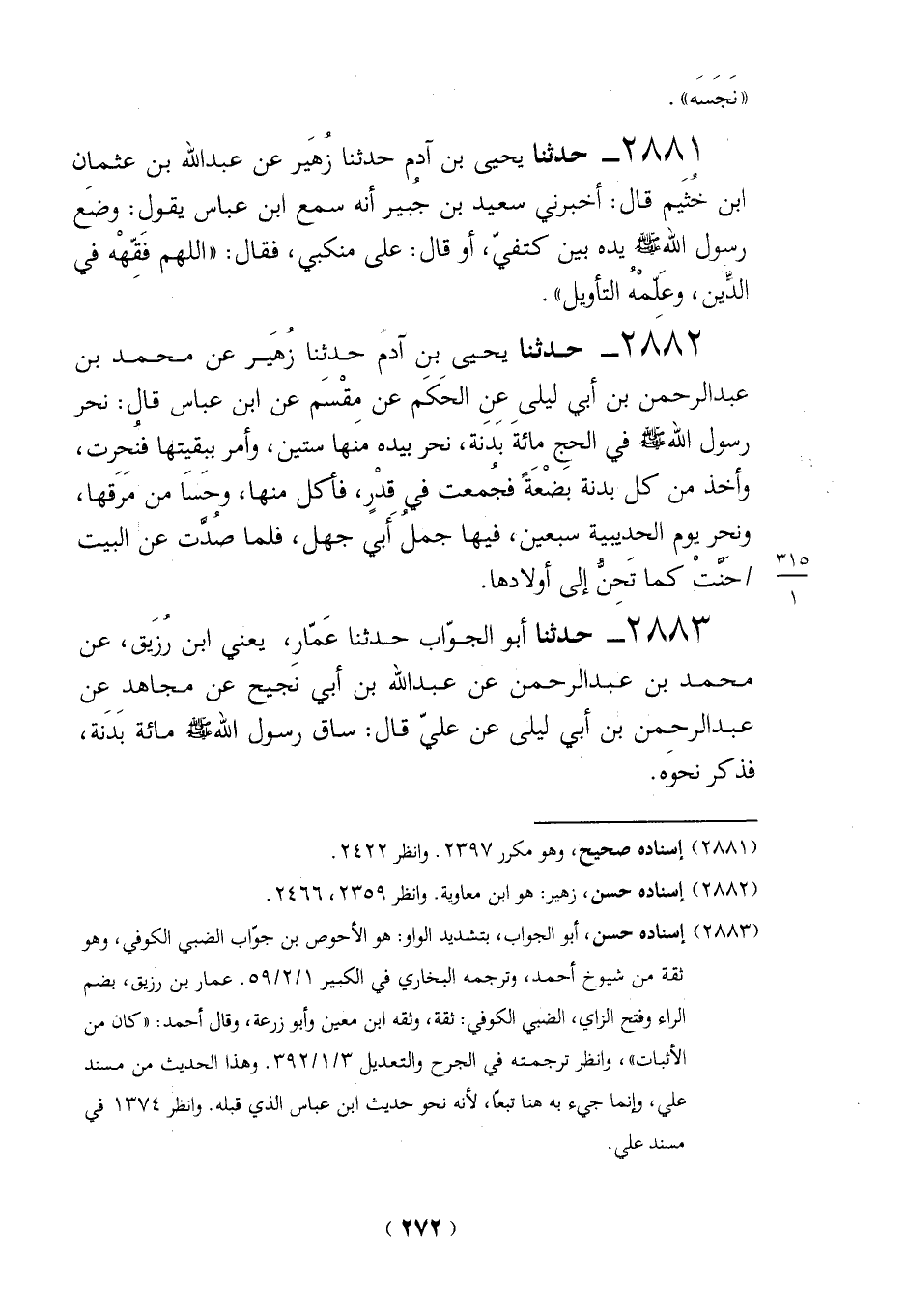 2882 - حدثنا يحيى بن آدم حدثنا زهَير عن محمد بن عبد الرحمن بن أبي ليلى عنِ الحَكَم عن مقْسَم عن ابن عباس قال: نحر رسول الله - صلى الله عليه وسلم - في الحج مائةَ بدنة، نحر بيده منَها ستين، وأمر ببقيتها فنُحِرت، وأخذ من كل بدنة بضْعَةً فجُمعت في قدْر، فأكل منها، وحسَا من مَرَقها، ونحر يوم الحديبية سبعين، فيها جملُ أَبى جهل، فلما صُدَّت عن البيت حنَّتْ كما تَحِنُّ إلى أولادها.