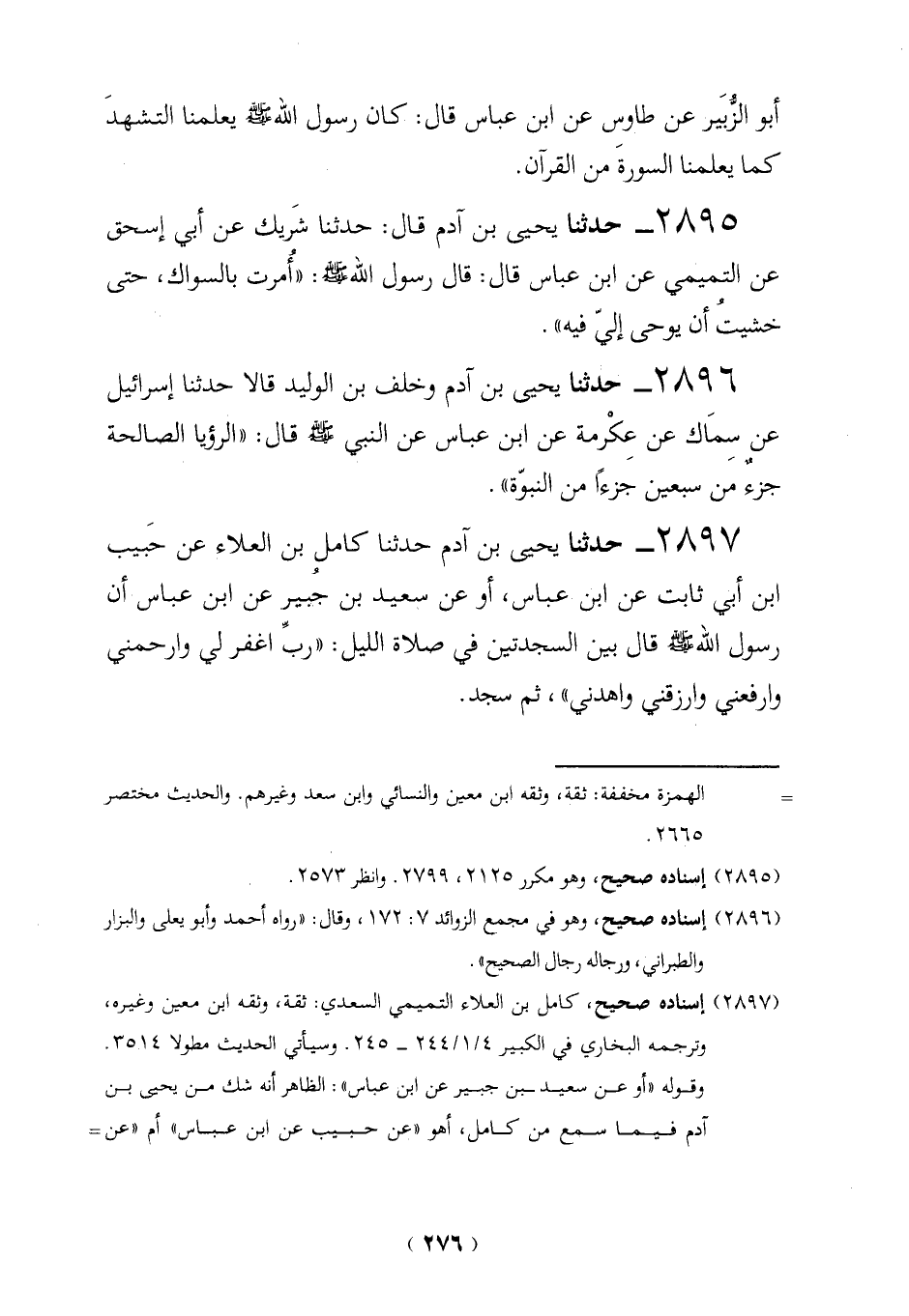 2895 - حدثنا يحيى بن آدم قال: حدثنا شَريك عن أبي إسحق عن التميمي عن ابن عباس قال: قال رسول الله - صلى الله عليه وسلم -: "أُمرت بالسواك، حتى خشيتُ أن يوحى إلىّ فيه".