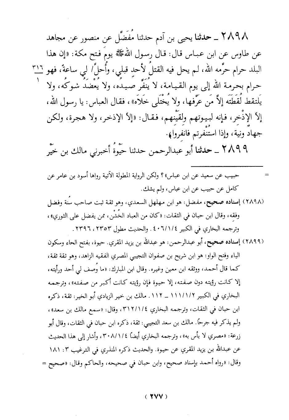2898 - حدثنا يحيى بن آدم حدثنا مُفَضَّل عنِ منصور عن مجاهد عن طاوس عن ابن عباس قال: قال رسول الله - صلى الله عليه وسلم - يوم فتح مكة: "إن هذا البلد حرام حرَّمه الله، لم يحل فيه القتلُ لأحدٍ قبلي، وأُحلَّ لِى ساعةً، فهو حرام بحرمة الله إلى يوم القيامة، لا يُنَفَّر صيدُه، ولا يُعْضَدُ شوكُه، ولا يَلتقط لُقَطَتَه إلاَّ مَن عرفها، ولا يُخْتَلى خَلاَه"، فقال العباس: يا رسول الله، إلاَّ الإذْخِر، فإنه لبيوتهم ولقَيْنِهم، فقال: "إلاَّ الإذخر، ولا هجرة، ولكن جهادٌ ونية، وإذا استُنْفرتم فانَفِروا".