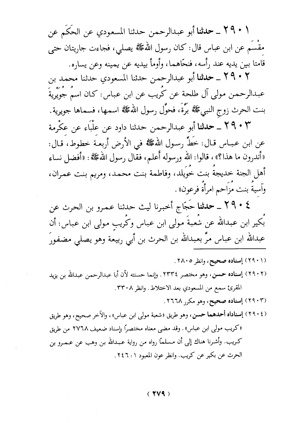2903 - حدثنا أبو عبد الرحمن حدثنا داود عن علْبَاء عن عكْرمة عن ابن عباس قال: خَطَّ رسول الله - صلى الله عليه وسلم - في الأرض أربعَة خطوط، َ قال: "أتدرون ما هذا؟ "، قالوا: الله ورسوله أَعلم، فقال رسول الله - صلى الله عليه وسلم -: "أفضل نساء أهل الجنة خديجةُ بنت خوَيلد، وفاطمة بنت محمد، ومريم بنت عمران، وآسيةُ بنت مُزَاحم امرأةُ فرعون".