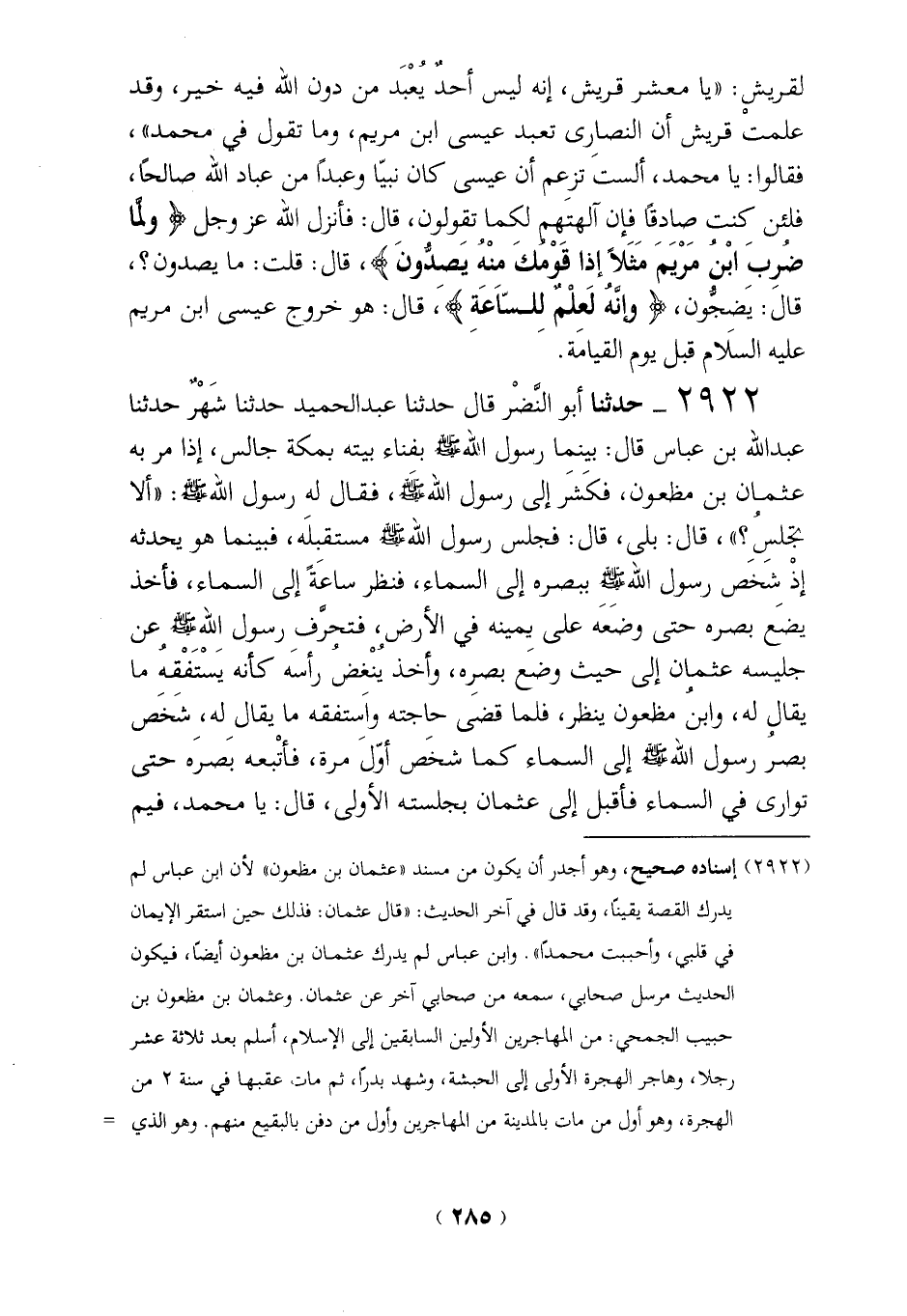 2922 - حدثنا أبو النَّضْر قال حدثنا عبد الحميد حدثنا شَهْرٌ حدثنا عبد الله بن عباس قال: بينما رسول الله - صلى الله عليه وسلم - بفناء بيته بمكة جالس، إذا مر به عثمان بن مظعون، فكَشَر إلى رسول الله - صلى الله عليه وسلم -، فقال له رسول الله - صلى الله عليه وسلم -: "ألا تجلسُ؟))، قال: بلى، قال: فجلس رسول الله - صلى الله عليه وسلم - مستقبلَه، فبينما هو يحدثه إذْ شَخَص رسول الله - صلى الله عليه وسلم - ببصره إلى السماء، فنظر ساعَةً إلى السماء، فأخذ يضع بصره حتى وضَعَه على يِمينه في الأرض، فتحرَّف رسول الله -صلي الله عليه وسلم- عن جليسه عثمان إلى حيث وضع بصرِه، وأخذ ينْغض رأسَه كأنه يَسْتَفْقِهُ ما يقال له، وابنُ مظعون ينظر، فلما قضى حاجته واَستفقه ما يقالِ له، شخص بصرُ رسول الله - صلى الله عليه وسلم - إلى السماء كما شخَص أولَ مرة، فأتْبعه بصره حتى توارى في السماء فأقبل إلى عثمان بجلسته الأولى، قال: يا محمد، فيم