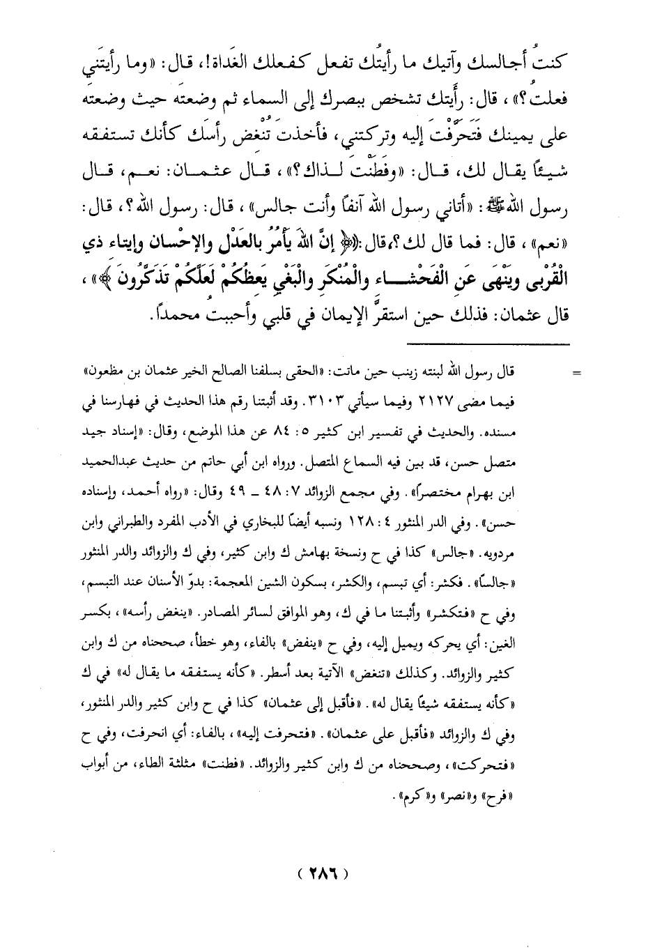 كنتُ أجالسك وآتيك ما رأيتُك تفعل كفعلك الغَداة!، قال: "وما رأيتَنىِ فعلتُ؟ "، قال: رأَيتك تشخص ببصرك إلى السماء ثم وضعتَه حيث وضعته على يمينك فَتَحَرَّفْتَ إليه وتركتني، فأخذتَ تُنْغض رأسَك كأنك تستفقه شيئاً يقال لك، قال: "وفَطَنْتَ لذاك؟ "، قَال عثمان: نعم، قال رسول الله-صلي الله عليه وسلم-: "أتاني رسول الله آنفاً وأنت جالس"، قال: رسول الله؟، قال: "نعم"، قال: فما قال لك؟، قال: " {إِنَّ اللَّهَ يَأْمُرُ بِالْعَدْلِ وَالْإِحْسَانِ وَإِيتَاءِ ذِي الْقُرْبَى وَيَنْهَى عَنِ الْفَحْشَاءِ وَالْمُنْكَرِ وَالْبَغْيِ يَعِظُكُمْ لَعَلَّكُمْ تَذَكَّرُونَ (90)} قال عثمان: فذلك حين استقَّر الإيمان في قلبي وَأحببتُ محمداً.