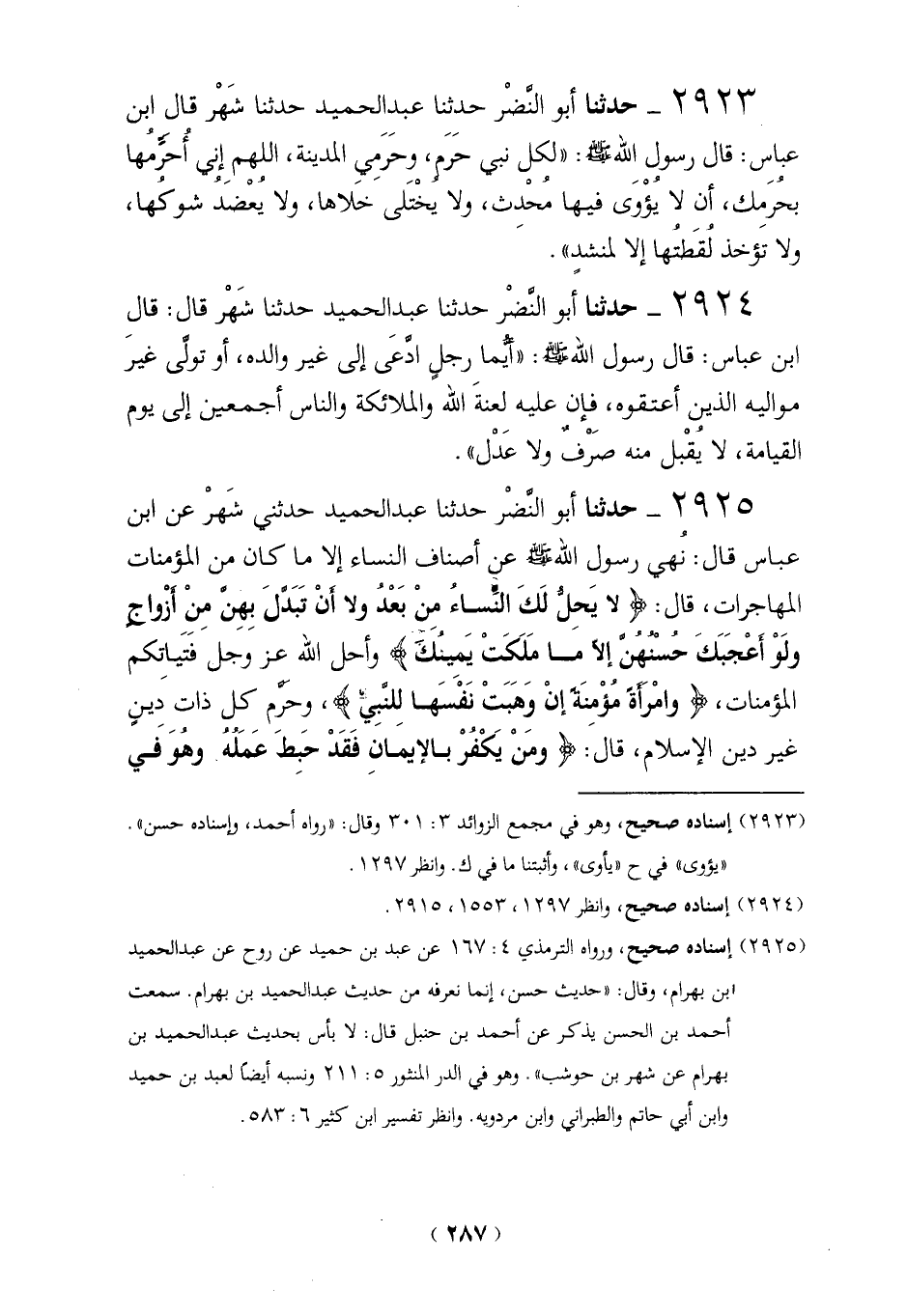 2925 - حدثنا أبو النَّضْر حدثنا عبد الحميد حدثني شَهرْ عن ابن عباس قال: نهى رسول الله - صلى الله عليه وسلم - عن أصناف النساء إلا ما كان من المؤمنات المهاجرات، قال: {لَا يَحِلُّ لَكَ النِّسَاءُ مِنْ بَعْدُ وَلَا أَنْ تَبَدَّلَ بِهِنَّ مِنْ أَزْوَاجٍ وَلَوْ أَعْجَبَكَ حُسْنُهُنَّ إِلَّا مَا مَلَكَتْ يَمِينُكَ} وأحل الله عز وجل فَتَياتِكم المؤمنات، {وَامْرَأَةً مُؤْمِنَةً إِنْ وَهَبَتْ نَفْسَهَا لِلنَّبِيِّ}، وحَرَّم كل ذات دَين غير دين الإسلام، قالَ: {وَمَنْ يَكْفُرْ بِالْإِيمَانِ فَقَدْ حَبِطَ عَمَلُهُ وَهُوَ فِي