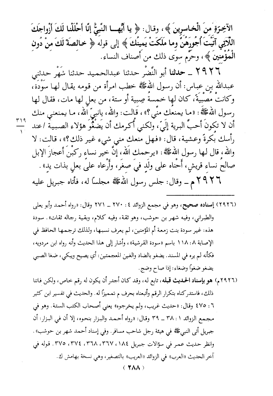 2926 - حدثنا أبو النَّضْر حدثنا عبد الحميد حدثنا شَهْر حدِثنِي عبد الله بن عباس: أن رسول الله - صلى الله عليه وسلم - خطب امرأة من قومه يقال لها سودة، وكانتْ مُصْبيَةً، كان لها خمسةُ صِبية أو ستة، من بعلٍ لها مات، فقال لها رسول الله - صلى الله عليه وسلم -: "ما يمنعُك منِّي؟ "، قَالت: والله، يِانبيِّ الله، ما يمنعني منك أن لا تكونَ أحبَّ البرية إلَىّ، ولكني أُكرمك أن يَضْغُو هؤلاء الصبية عند رأسك بُكرةً وعشية، قال: "فهل منعك مني شيء غيرذلك؟ "، قالت: لا والله، قال لها رسول الله-صلي الله عليه وسلم-: "يرحمكِ اَلله، إنَّ خير نساء ركبْنَ أعجازَ الإبل صالحُ نساء قريشٍ، أَحْناه على ولَدٍ في صِغَر، وأَرْعاه على بعلٍ بذات يدٍ".