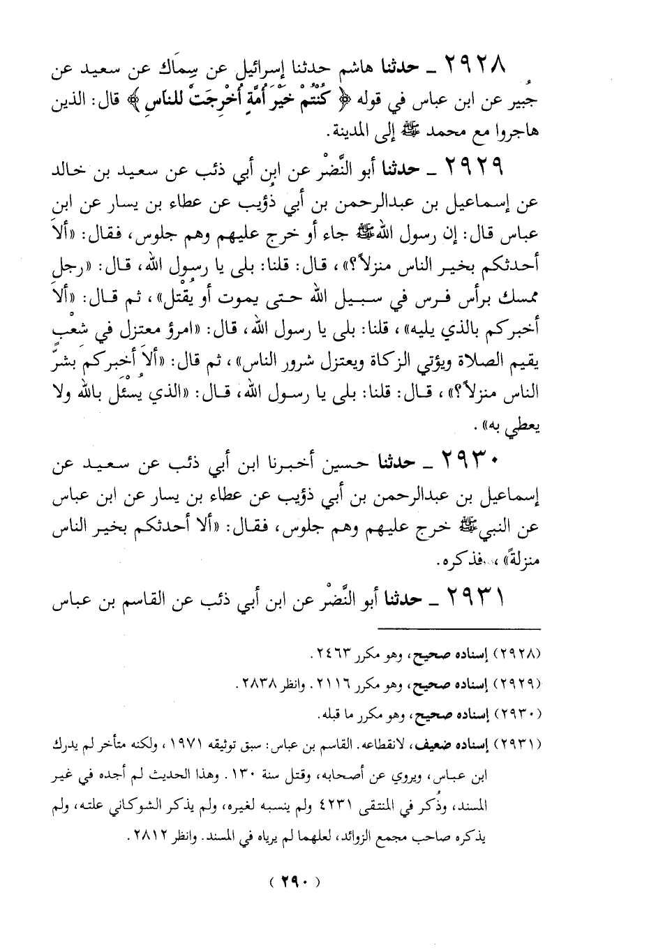 2929 - حدثنا أبو النَّضْر عن ابن أبي ذئب عن سعيد بن خالد عن إسماعيل بن عبد الرحمن بن أبي ذُؤيب عن عطاء بن يسار عن ابن عباس قال: إن رسول الله -صلي الله عليه وسلم- جاء أو خرج عليهم وهم جلوس، فقال: "ألاَ أحدثكم بخير الناس منزلاً؟ "، قال: قلنا: بلى يا رسول الله، قال: "رجلِ ممسك برأس فرس في سبيل الله حتى يموت أو يقْتل"، ثم قال: "ألا أخبركم بالذي يليه"، قلنا: بلى يا رسول الله، قال: "امرؤ معتزل في شِعْبٍ يقيم الصلاة ويؤتي الزكاة ويعتزل شرور الناس"، ثم قال: "ألاَ أخبركمَ بشرّ الناس منزلاً؟ "، قال: قلنا: بلى يا رسول الله، قال: "الذي يُسْئَل بالله ولا يعطى به".