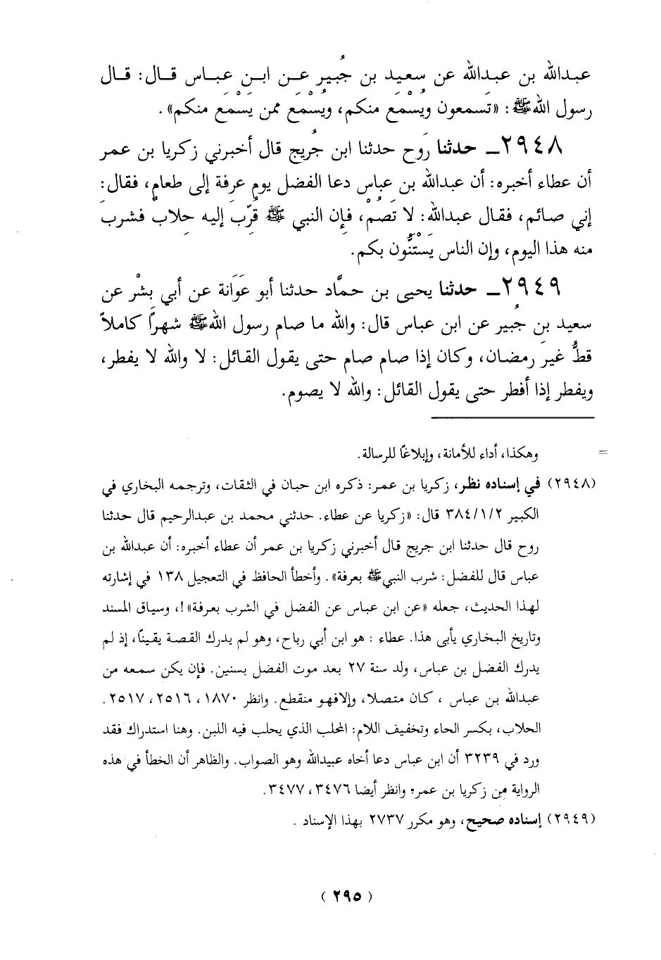 2948 - حدثنا رَوح حدثنا ابن جُريج قال أخبرني زكريا بن عمر أن عطاء أخبره: أن عبد الله بن عباس دعا الفضل يوم عرفة إلى طعامٍ، فقال: إني صائم، فقال عبد الله: لا تَصُمْ، فإن النبي - صلى الله عليه وسلم - قُرّبَ إليه حِلابٌ فشربَ منه هذا اليوم، وإن الناس يَسْتنُّون بكم.
