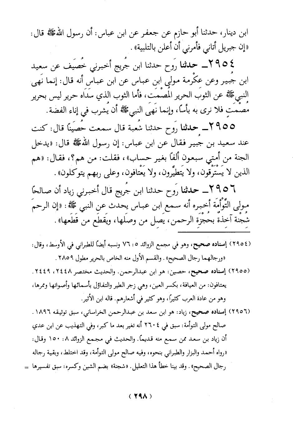 2955 - حدثنا رَوح حدثنا شُعبة قال سمعت حُصَيناً قال: كنت عند سعيد بن جُبير فقال عن ابن عباس: إن رسول الله - صلى الله عليه وسلم - قال: "يدخل الجنة منِ أمِتي سبعون ألفاً بغير حساب"، فقلت؟ من هم؟، فقال: "هم الذين لا يَسْتَرْقون، ولا يَتطيَّرون، ولا يَعْتافون، وعلى ربهم يتوكلون".