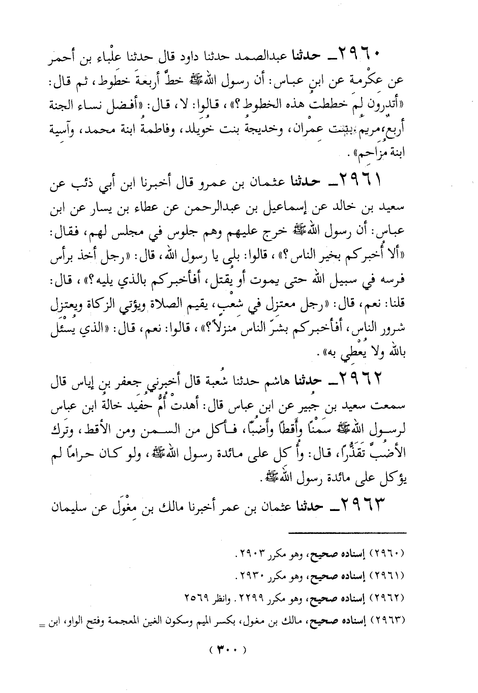 2960 - حدثنا عبد الصمد حدثنا داود قال حدثنا علْباء بن أحمر عن عكْرمة عن ابن عباس: أن رسول الله-صلي الله عليه وسلم- خطَّ أربعةَ خطَوط، ثم قال: "أتدروَن لمَ خططتُ هذه الخطوط؟ "،قالوِا: لا، قال: "أفضل نساء الجنة أربعٌ، مريمُ بنت عِمْران، وخديجة بنت خويلد، وفاطمةُ ابنة محمد، وآسية ابنة مُزَاحم".
