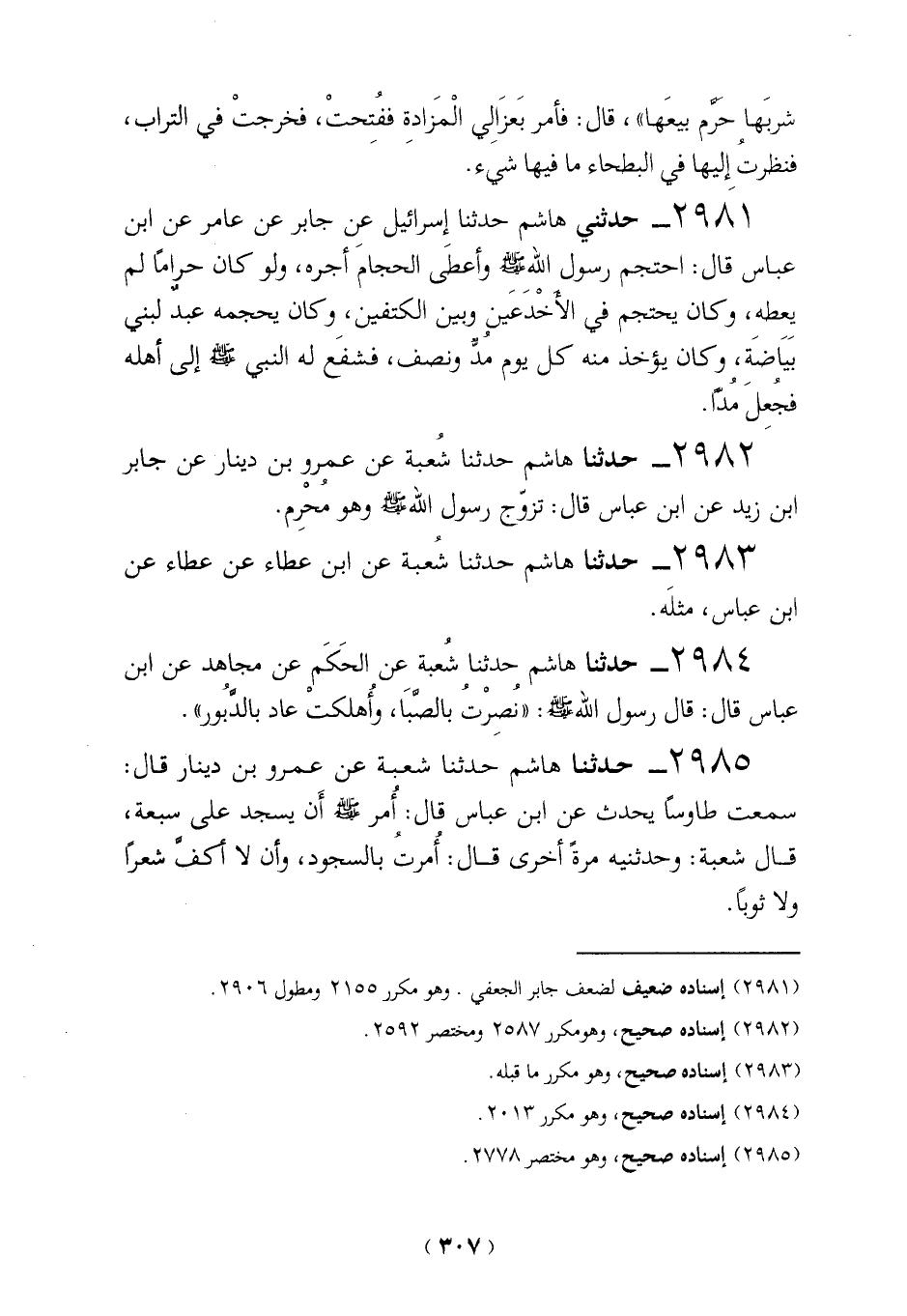 2985 - حدثنا هاشم حدثنا شعبة عن عمرو بن دينار قال: سمعت طاوساً يحدت عن ابن عباس قال: أمر - صلى الله عليه وسلم - أَن يسجد على سبعة، قال شعبة: وحدثنيه مرةً أخرى قال: أُمرتُ بالسجود، وأدن لا أكفَّ شعراً ولا ثوباً.